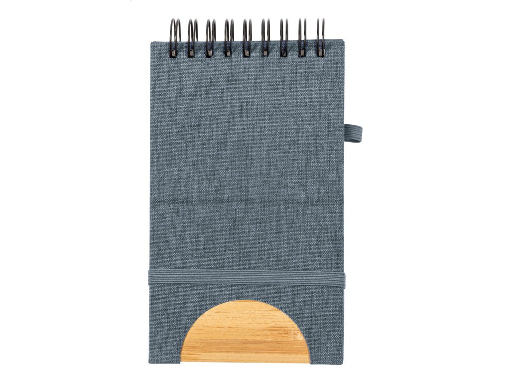 Špirálový blok potiahnutý polyesterom RPET s bambusovou vložkou a funkciou držiaka mobilného telefónu. S 80 prázdnymi stranami, gumičkou a držiakom na pero.Dodatočné parametre