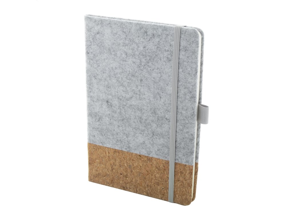Blok A5 z RPET plsti a prírodného korku s 80 linajkovými listami z recyklovaného papiera. So záložkou, gumovým pásikom a držiakom na pero.