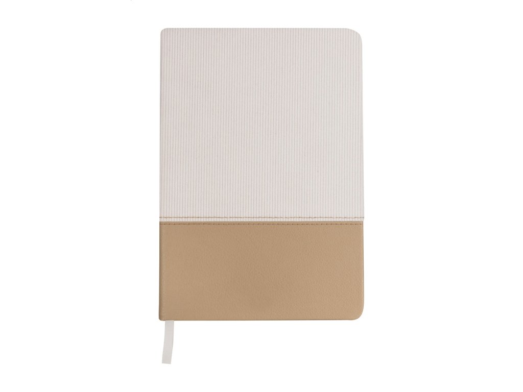 Blok A5 potiahnutý textúrovaným polyesterom a recyklovanou PU kožou so záložkou a 80 linajkovými listami.