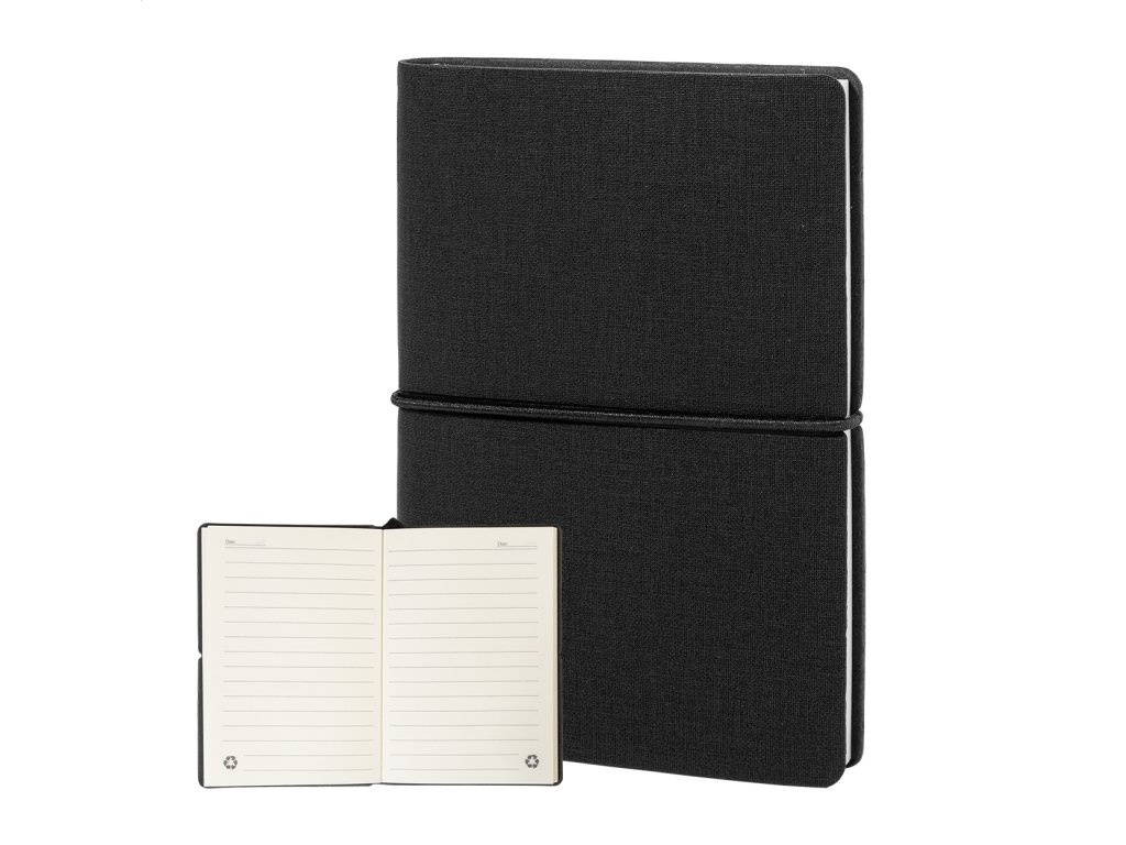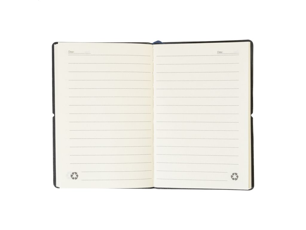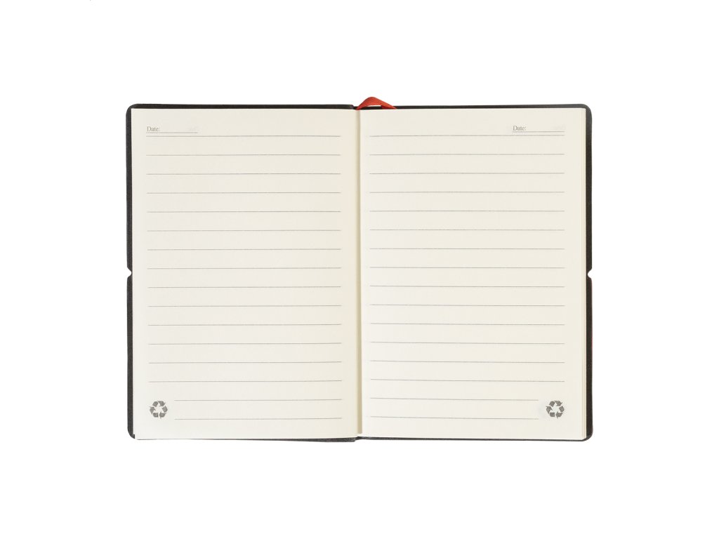 Blok A6 s recyklovanou PU kožou, 70 linkovanými listami z recyklovaného papiera, 25 samolepiacimi papierikmi a 125 značkovačmi stránok (v 5 rôznych farbách). So záložkou a horizontálnym gumovým pásikom.Dodatočné parametre