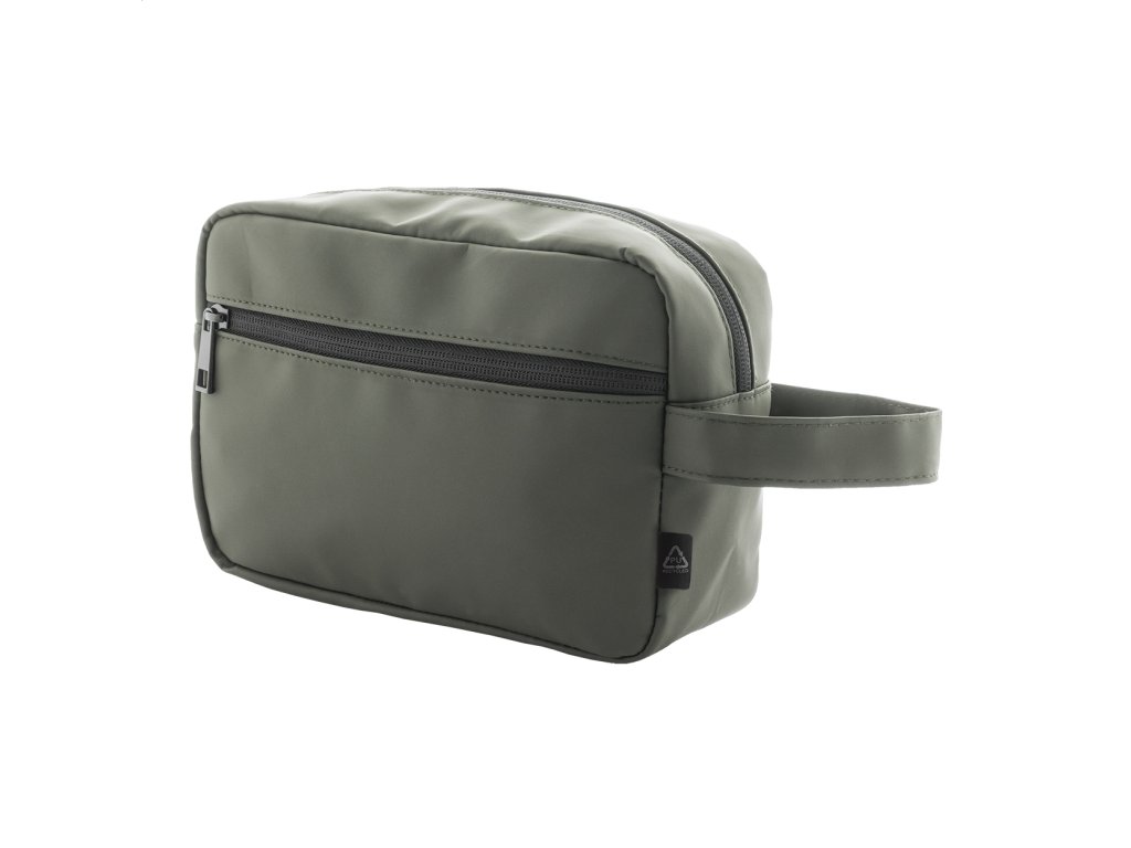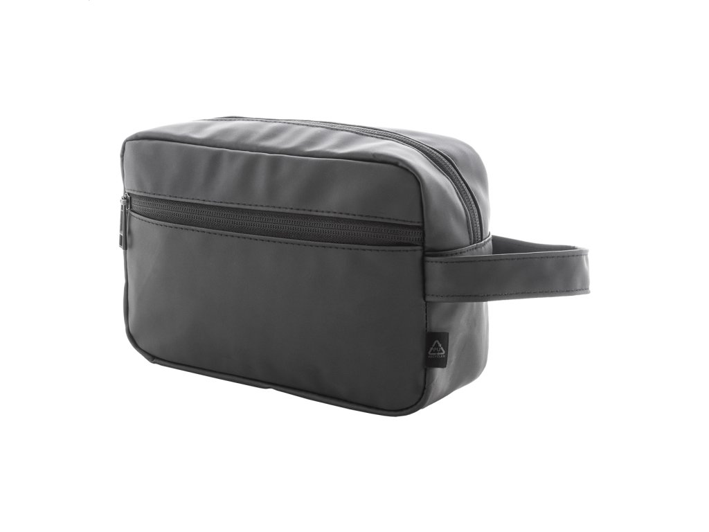 Kozmetická taštička z mäkkej recyklovanej PU kože s dvoma priehradkami na zips a uchom. S výrazným recyklovaným PU štítkom.Dodatočné parametre