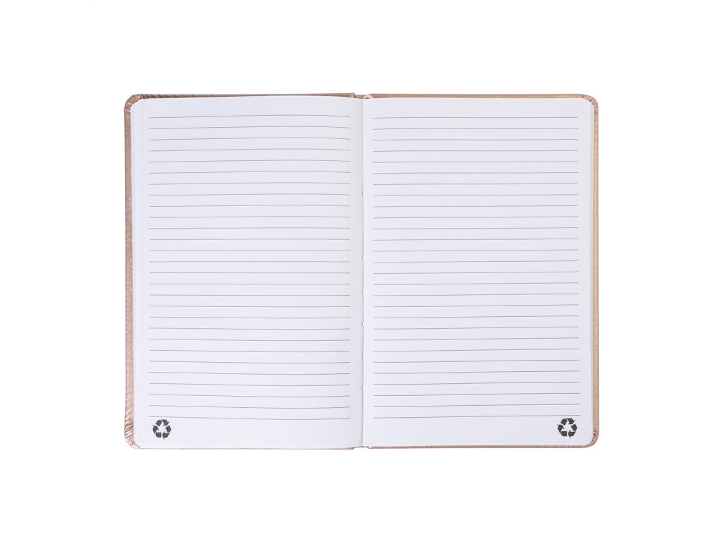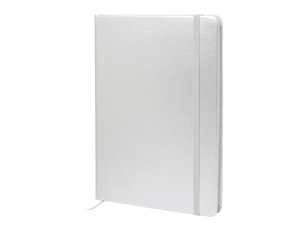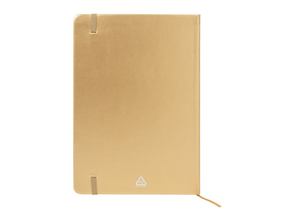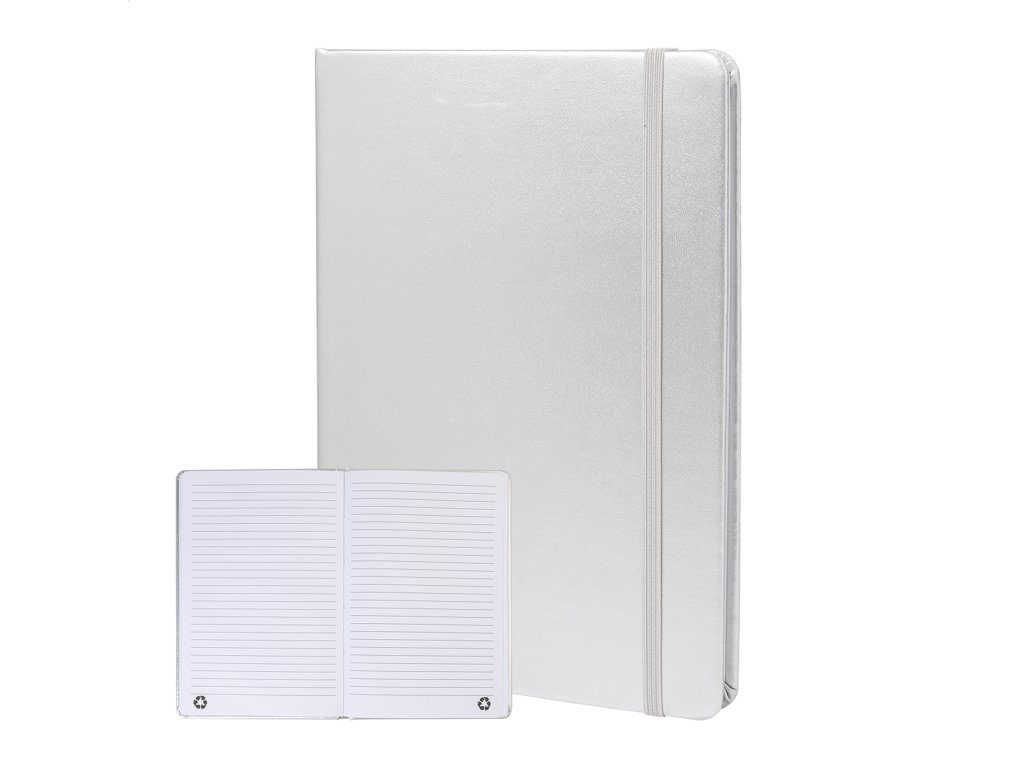 Blok A5 s kovovým povrchom a poťahom z recyklovanej PU kože so 100 linajkovými listami z recyklovaného papiera. S farebnou záložkou a gumičkou.Dodatočné parametre