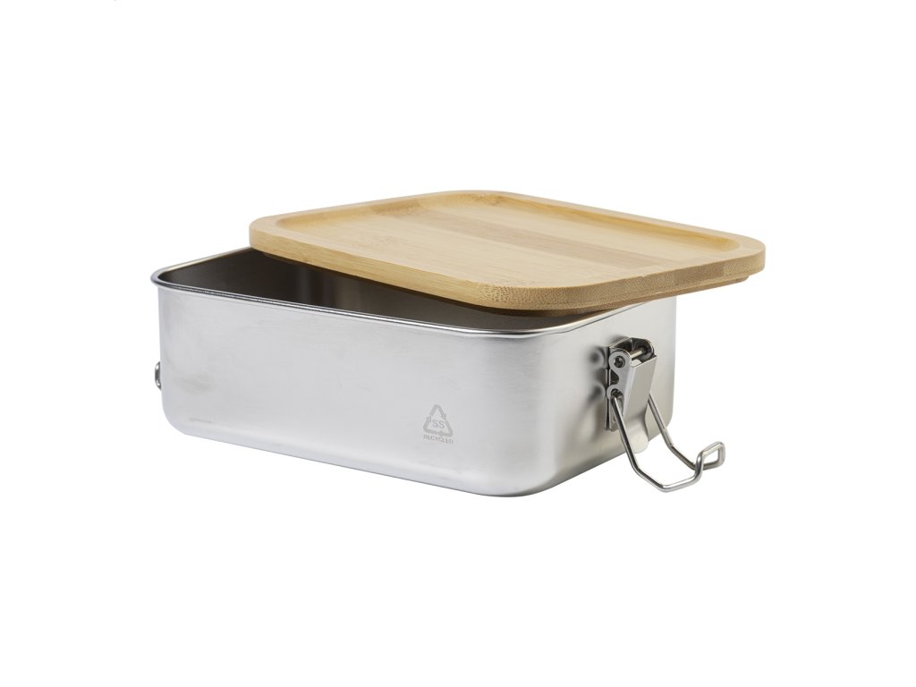 Box na jedlo z recyklovanej nerezovej ocele s bambusovým vekom a bezpečným zapínaním na pracku, 750 ml.Dodatočné parametre