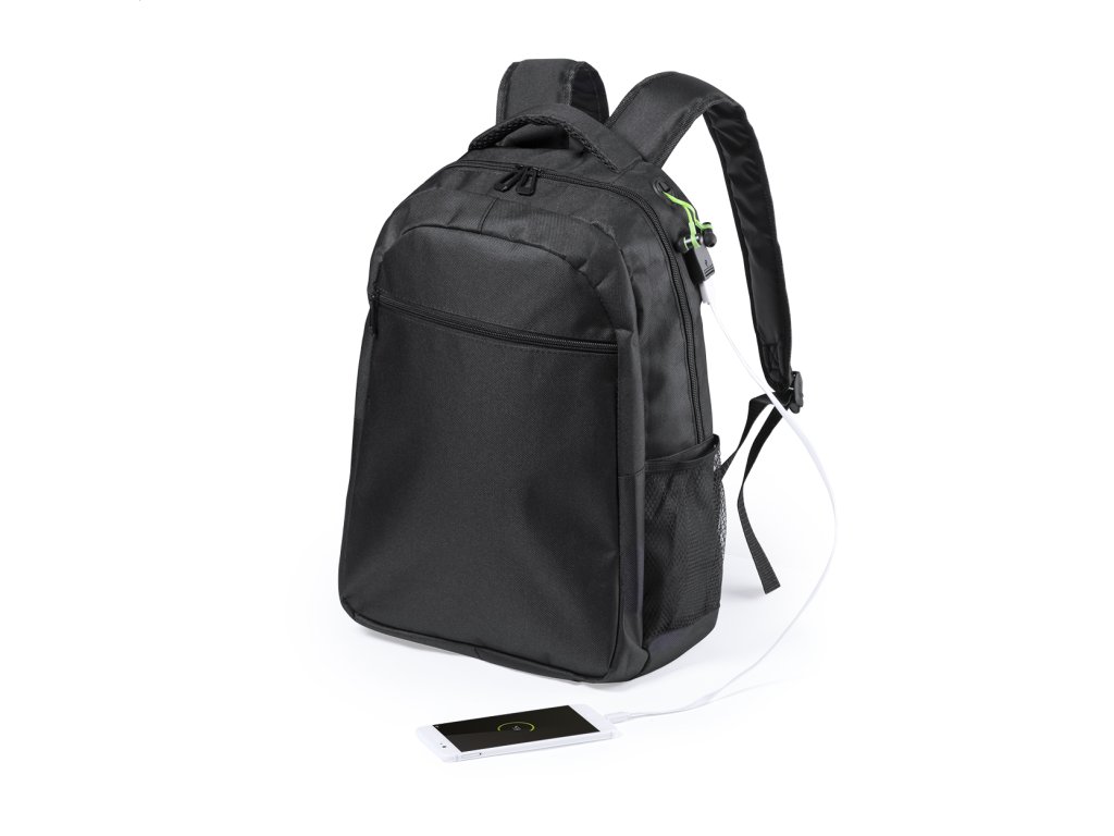 Vodeodolný ruksak s priehradkami na zips, vystuženou priehradkou na notebook (15") a tablet (10") a vystuženými ramennými popruhmi. S výstupom na slúchadlá a so vstavaným USB pripojením na power banku. 600D polyester.Dodatočné parametre