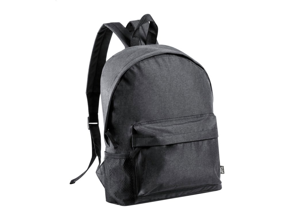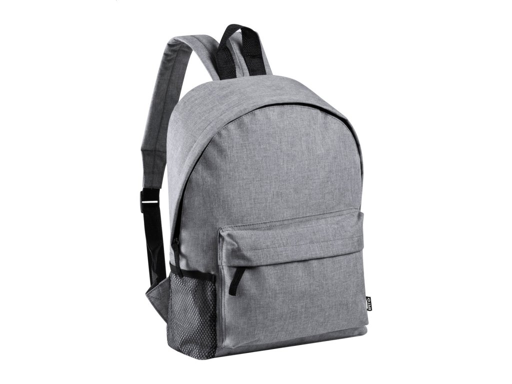 Ruksak s predným vreckom na zips, bočným vreckom zo sieťoviny, polstrovaným chrbátom a ramennými popruhmi. Recyklovaný PET polyester 600D.