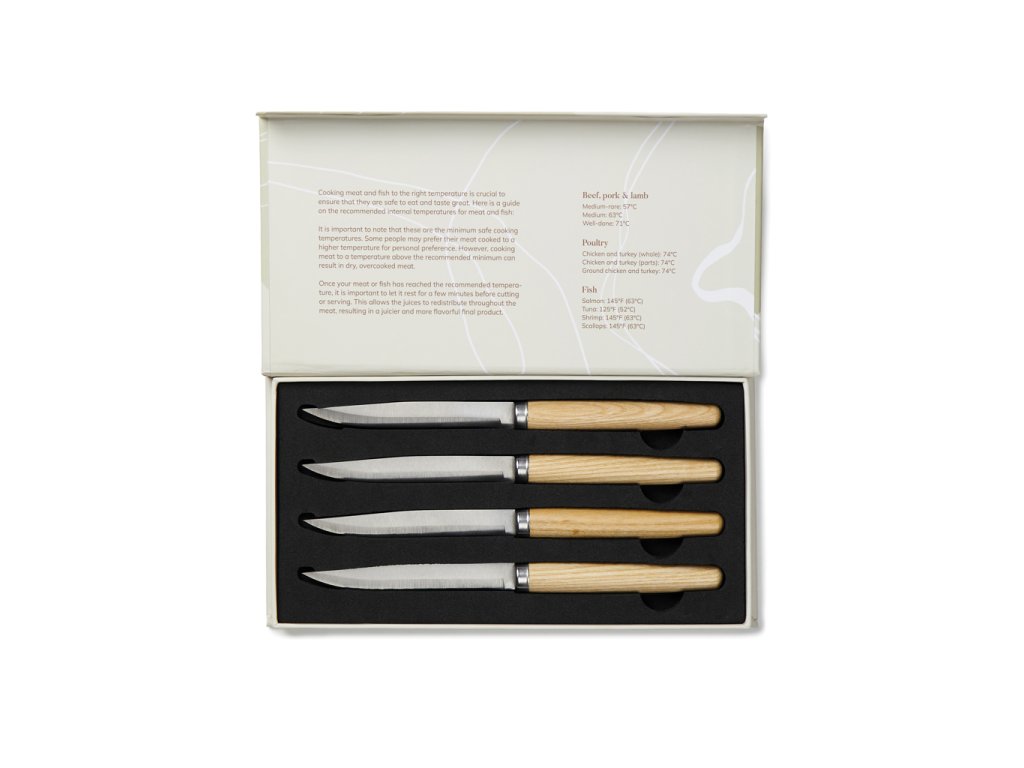Sada 4 ks nožov v typickom škandinávskom dizajne. Čepeľ vyrobená z vysoko kvalitnej nehrdzavejúcej ocele, madlo z jaseňového dreva. Nielen, že skvele fungujú pri práci, v kuchyni aj skvele vyzerajú. Balené v darčekovej krabičke s kulinárskymi odporúčaniami na vnútornej strane veka.Dodatočné parametre