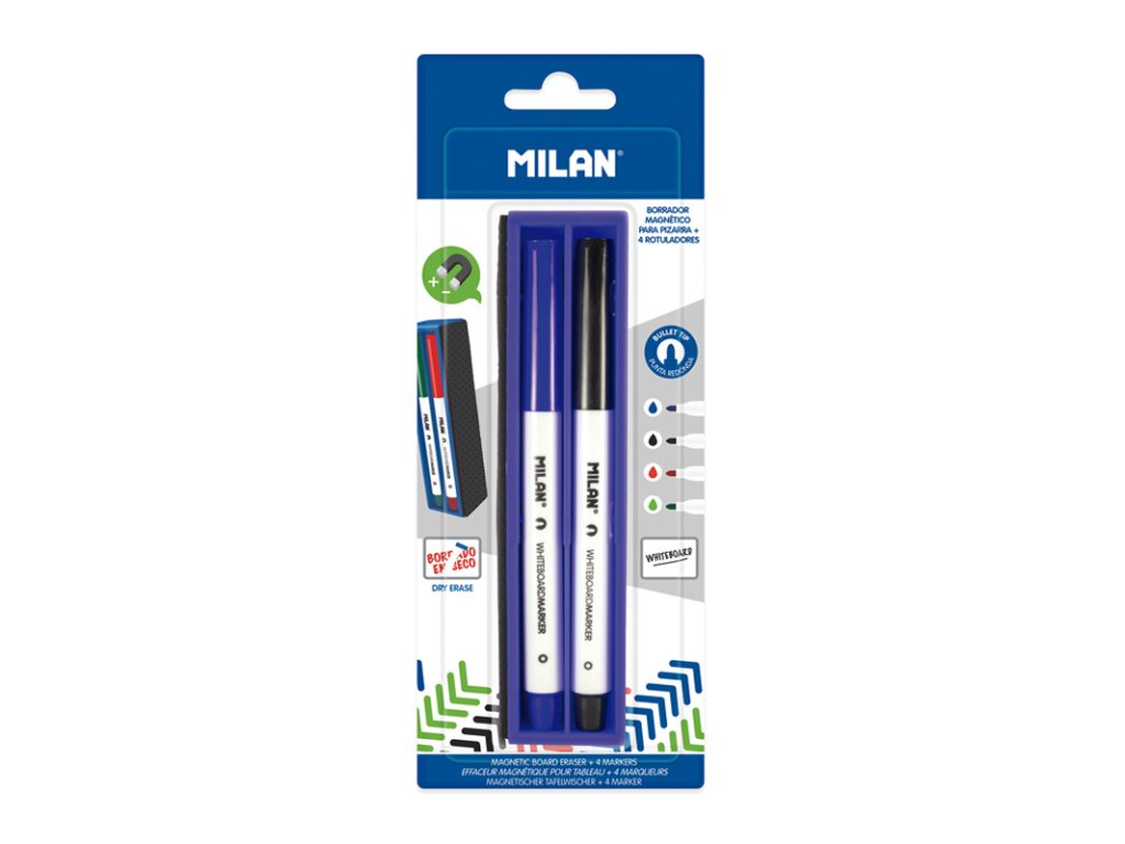 Popisovač na biele tabule s magnetickou hubkou. Popisovač na biele tabule, stierateľný atrament na liehovej báze, svetlostály. Valcový hrot s priemerom 3,7 mm. Súčasťou balenia je 1 ks magnetickej stierky a 4 popisovače: modrý, červený, zelený a čierny.Dodatočné parametre
