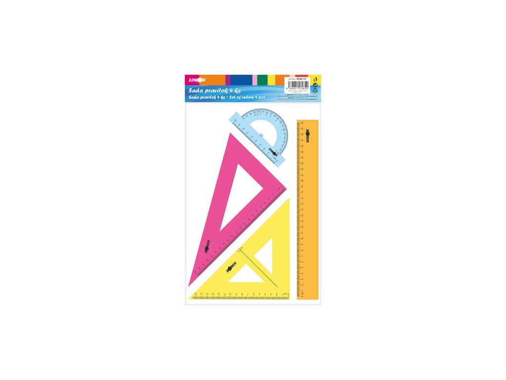 4-kusová rysovacia sada pravítok, vyrobená z transparentného plastu. Súčasťou súpravy je trojuholník s ryskou 16 cm, pravouhlý trojuholník 24cm, pravítko 30cm a uhlomer 10cm. Balené v plastovom puzdre. Kvalitná, cenovo dostupná sada, ktorú firma JUNIOR ponúka pod vlastnou značkou.Dodatočné parametre