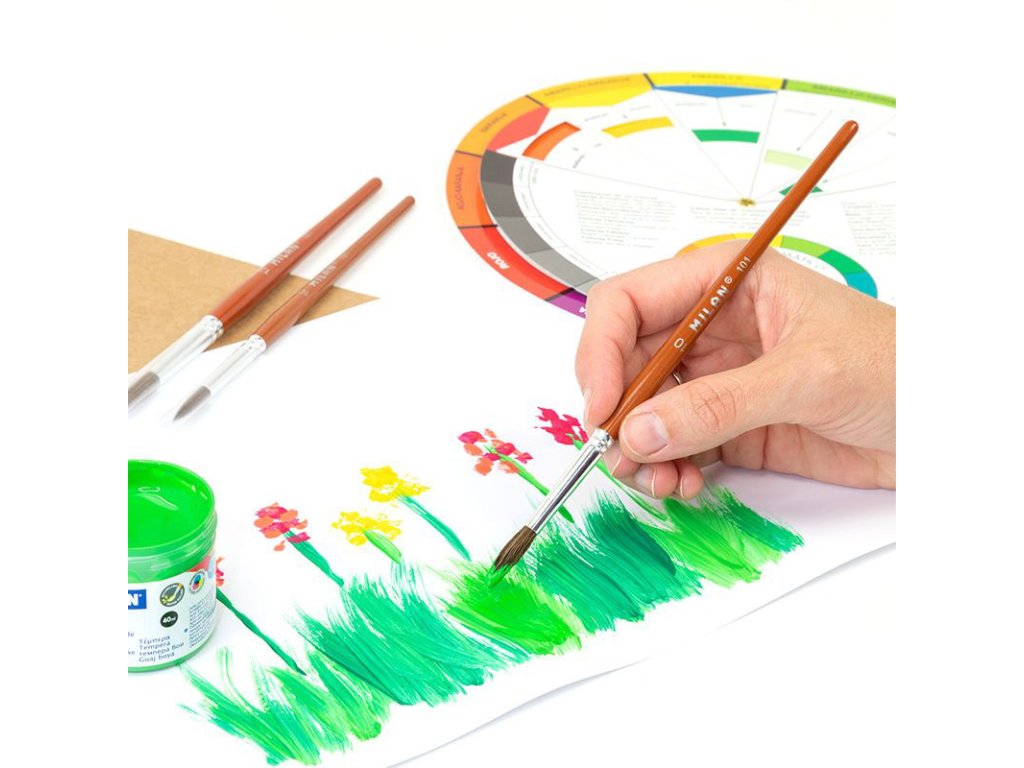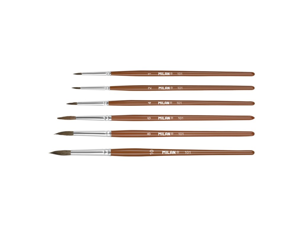 Okrúhle štetce s krátkou drevenou rúčkou. Hnedá lakovaná povrchová úprava a hliníková dutinka. Zloženie: 70% prírodné kozie vlasy + 30% syntetické. Vhodné pre akvarely, techniky na báze vody a farby na plagáty. Obsahuje: 24 štetcov číslo 1, 2, 4 a 6 a 12 štetcov číslo 8 a 10.Dodatočné parametre