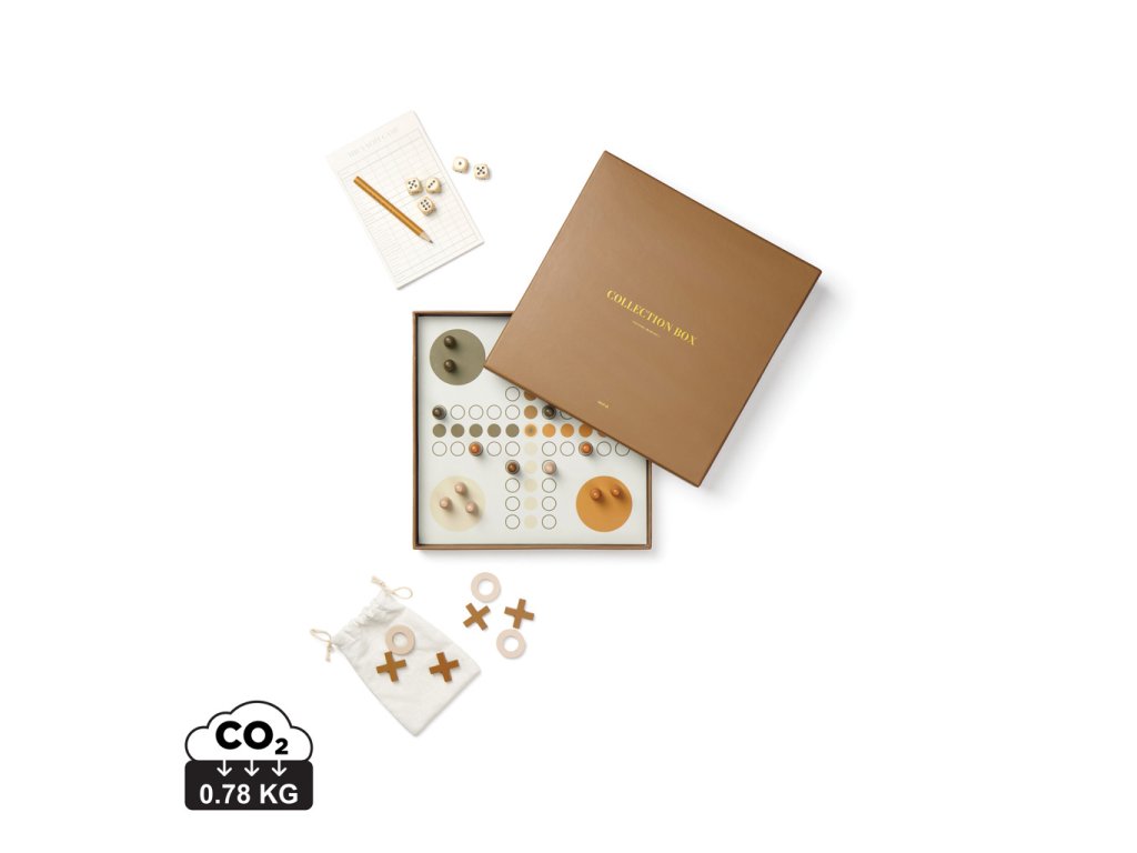 Sada stolných hier obsahujúca 3 klasické hry: Yacht game (kocky), Ludo (človeče nehnevaj sa) a Tic-Tac-Toe (piškvorky). Všetko balené v mimoriadne elegantnej krabičke, ktorá je sama o sebe dekoratívnym prvkom do domácnosti. Skvelý darček, ktorý zaručene zaujme a poskytne hodiny zábavy.Dodatočné parametre