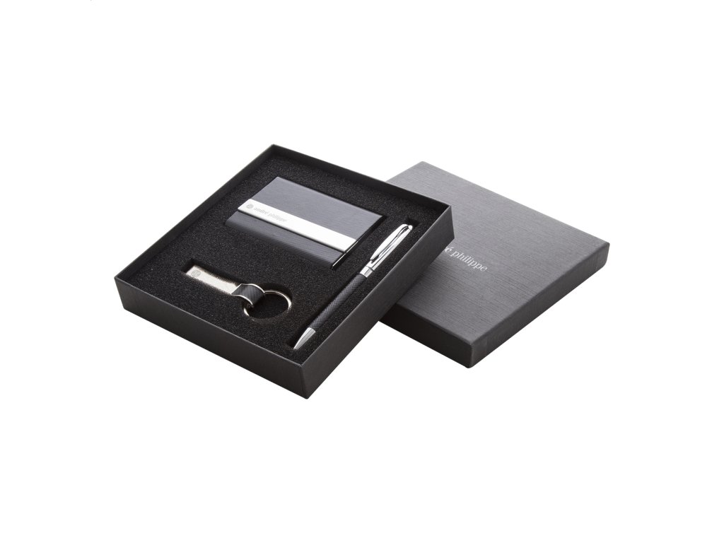 Elegantná sada s guľôčkovým perom a čiernou náplňou, stojanom na vizitky a kľúčenkou. Materiál: kov/PU koža. Značkový produkt André Philippe.