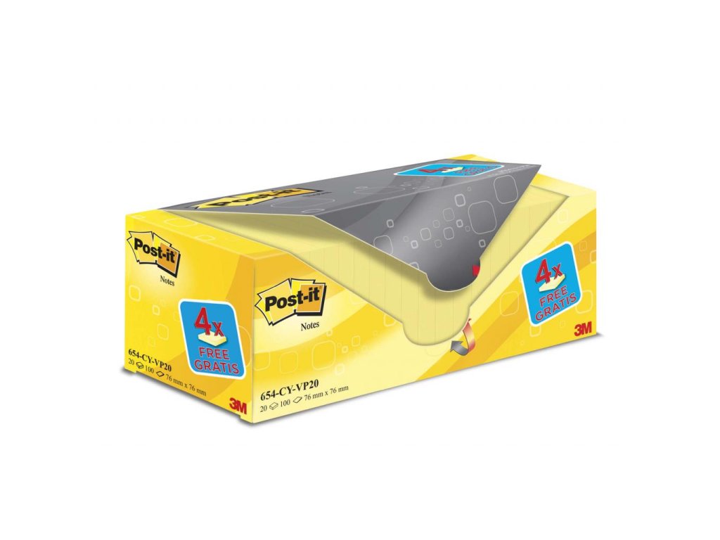 Zvýhodnené balenie žltých bločkov s jednoduchou manipuláciou. Papierový obal roztrhnutím na naznačenom mieste rozdelí balenie na 2 časti, ktoré sa ľahko uskladnia na stole alebo v zásuvke. Rozmery 76 x 76 mm. Počet lístkov 20 x 100.- `Poznačte si, pošlite správu alebo nechajte pripomienku pomocou Post-it® Canary Yellow™ bločkov.