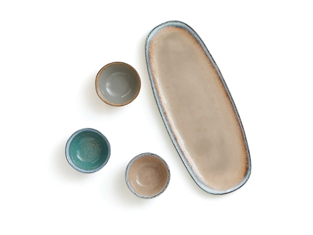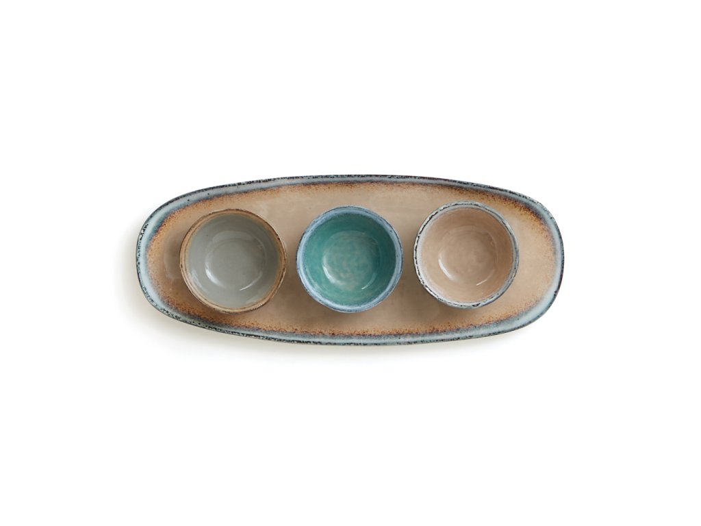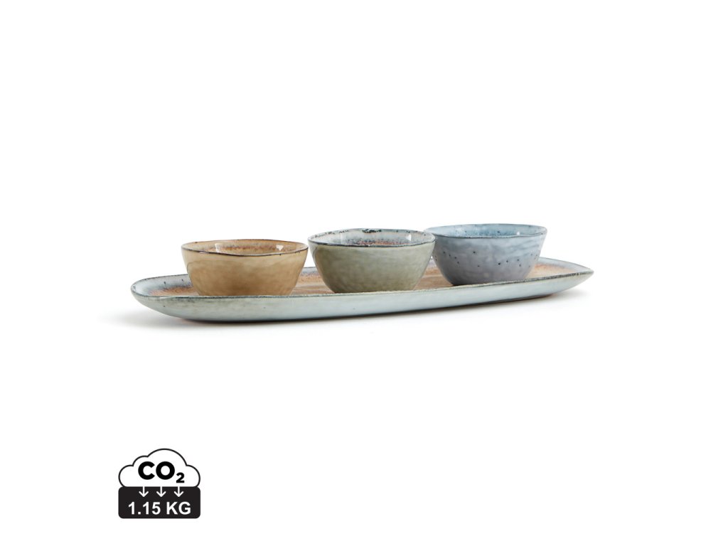 Kameninový servírovací tanier s tromi malými miskami. Široké možnosti servírovania: tapas, dipy alebo menšie občerstvenie. Samotný servírovací tanier sa skvele hodí na podávanie šalátov alebo jednohubiek. Nomimono čerpá inšpiráciu z prírody a zeme okolo nás a prináša tento rustikálny rad v prírodných zemitých tónoch. Každý predmet je ručne vyrobený a jedinečný. Každá položka je trikrát skontrolovaná, aby sa dosiahla správna povrchová úprava. Vhodné do umývačky riadu a mikrovlnnej rúry.Dodatočné parametre