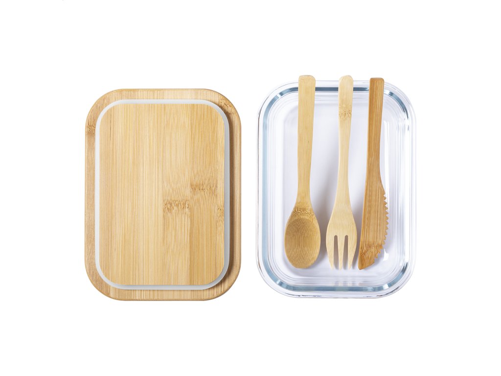Sklenený lunch box s vekom z prírodného bambusu. S bambusovým príborom (nôž, vidlička a lyžica) a elastickým pásom, 500 ml.Dodatočné parametre