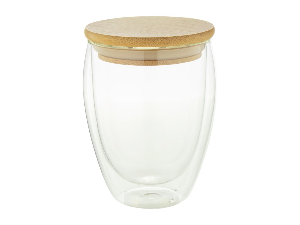 Dvojstenný termohrnček z borosilikátového skla s bambusovým viečkom, 320 ml. V kraftovej papierovej krabici.Dodatočné parametre