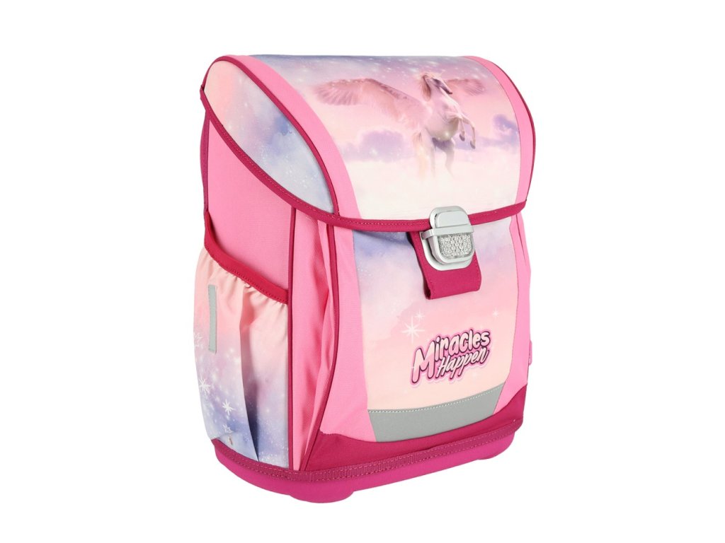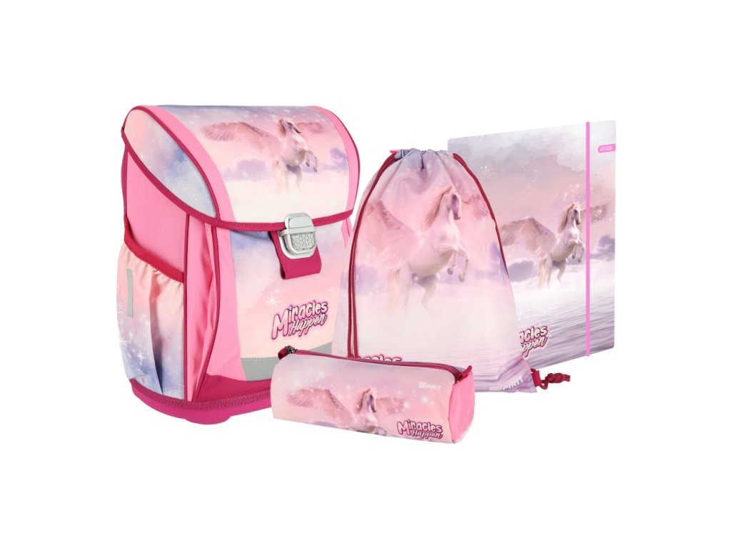 Sada obsahuje: školskú tašku, vrecko na prezúvky, dosky na zošity A4, okrúhle puzdro na písacie potreby (prázdne).