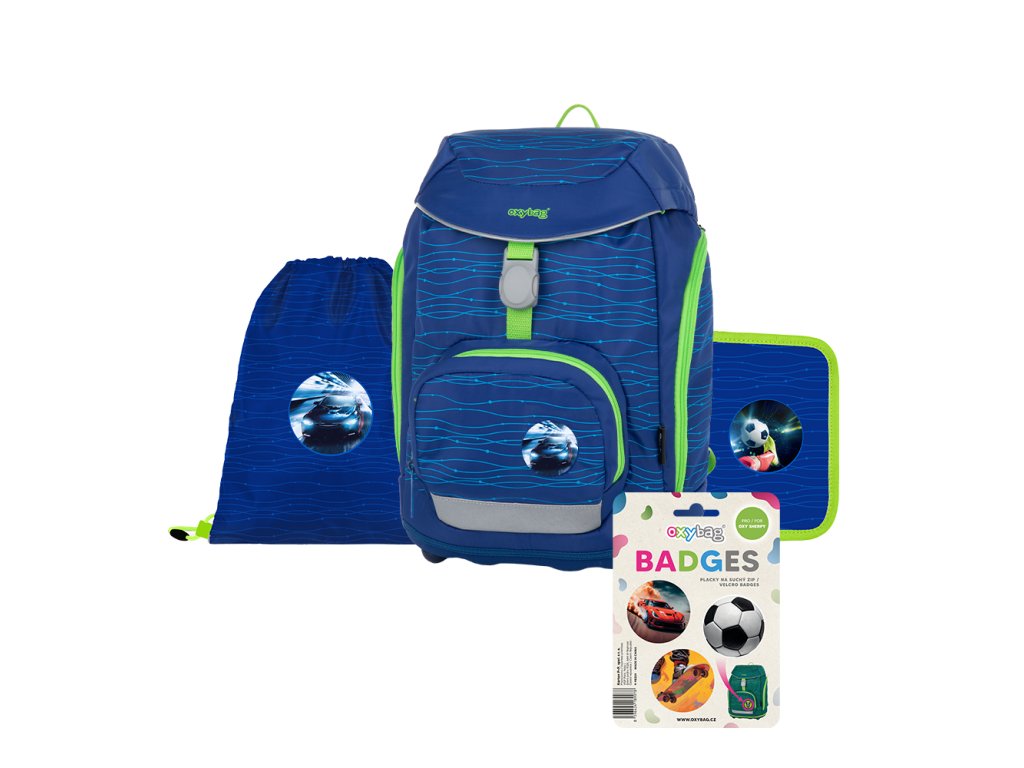 Výhodný set batohu, peračníka, vrecka na cvičky a vymeniteľných odznakov, vhodný od 1. - 3. triedy.