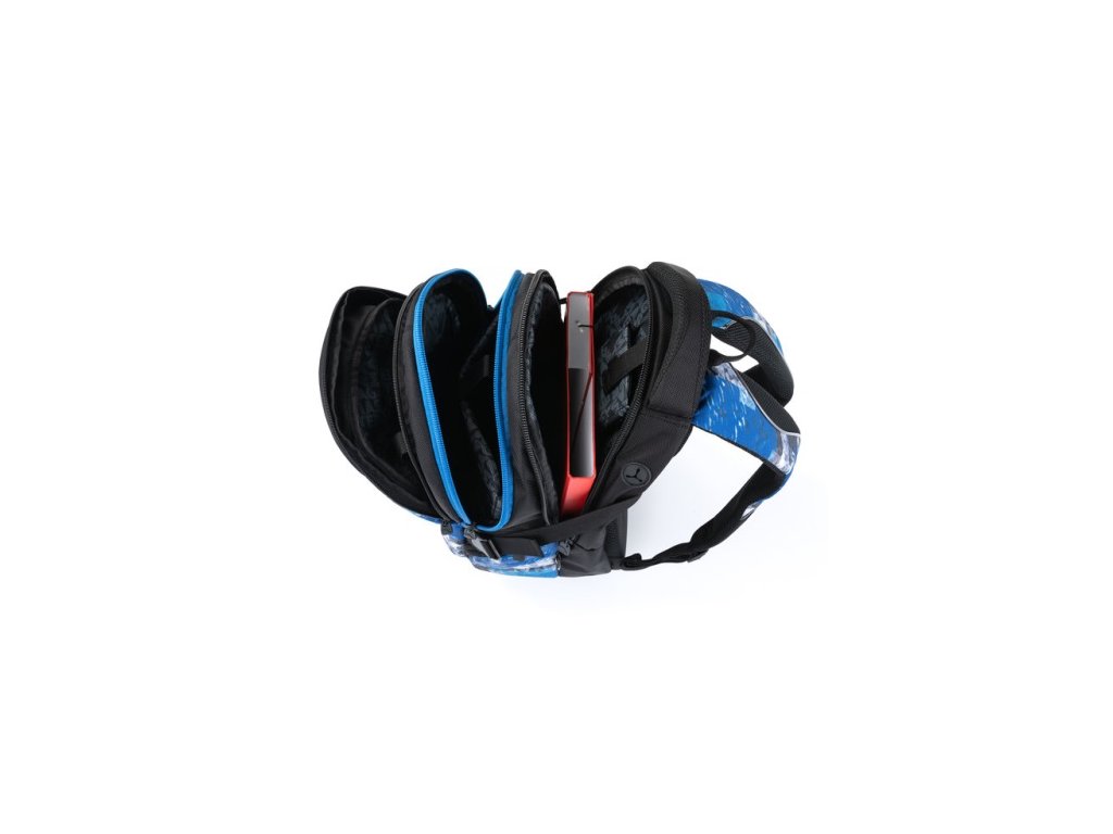 vnútri komory veľké vrecko na gumu a polstrované vrecko na MP3 prehrávač alebo power banku (rozmery kapsičky: 8,5 x 10 x 2cm), z hlavnej komory je vývod na kábel alebo slúchadlá..