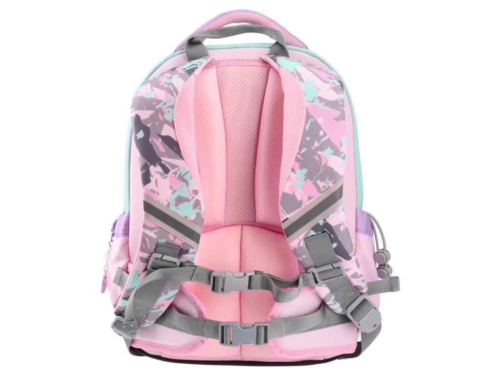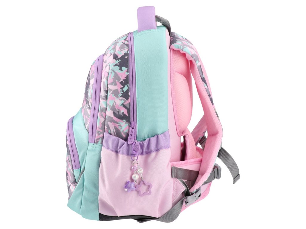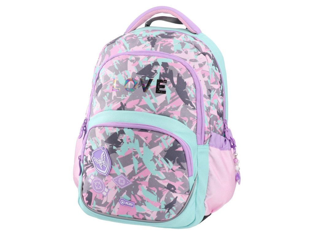 Ľahký školský batoh s anatomickým chrbtom, príveskom s gorálkami, nášivkou motýľa a dúhovým nápisom Love na prednej časti.