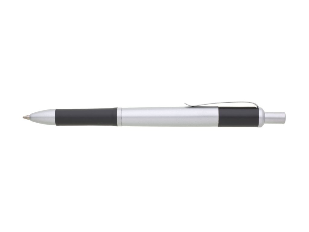 Semigelová propiska s matným stříbrným tělem a doplňky má tmavě modrý úchyt a zadní část těla. Náplň X20 semigel, modře píšící.