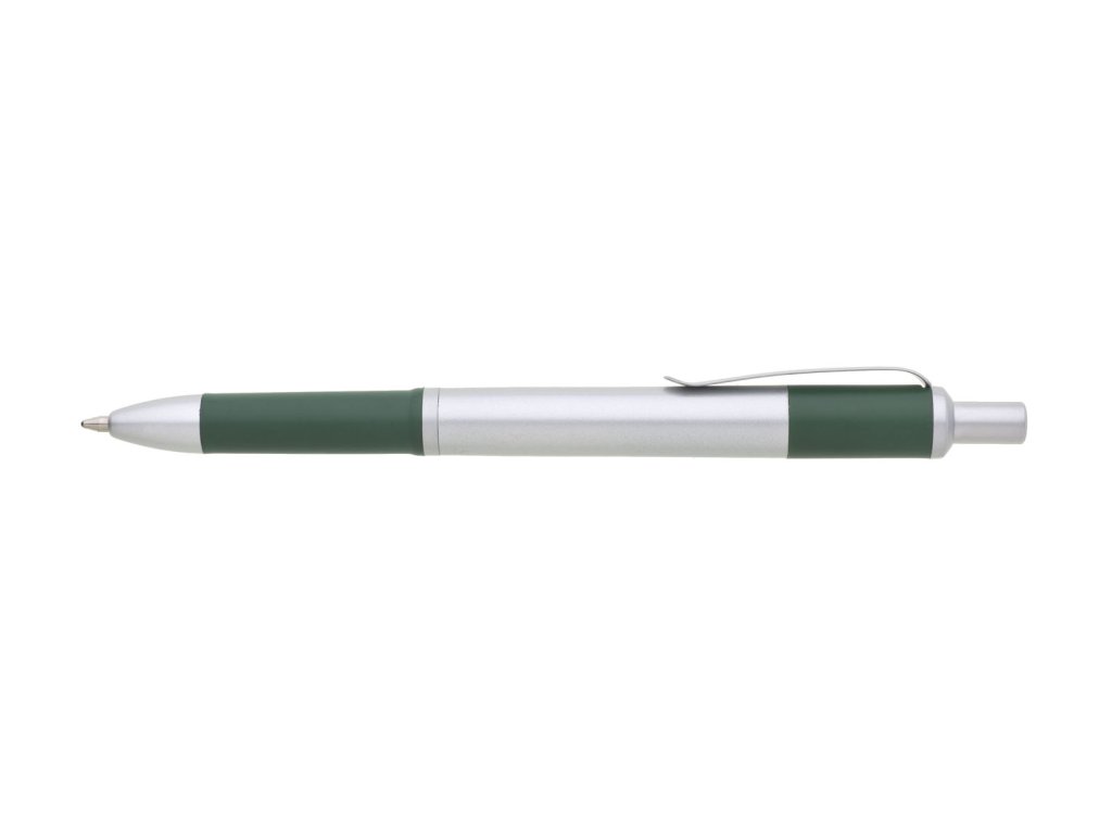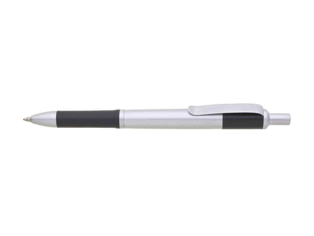 Propiska s matným stříbrným tělem a doplňky má tmavě modrý úchyt a zadní část těla. Náplň X20, modře píšící.