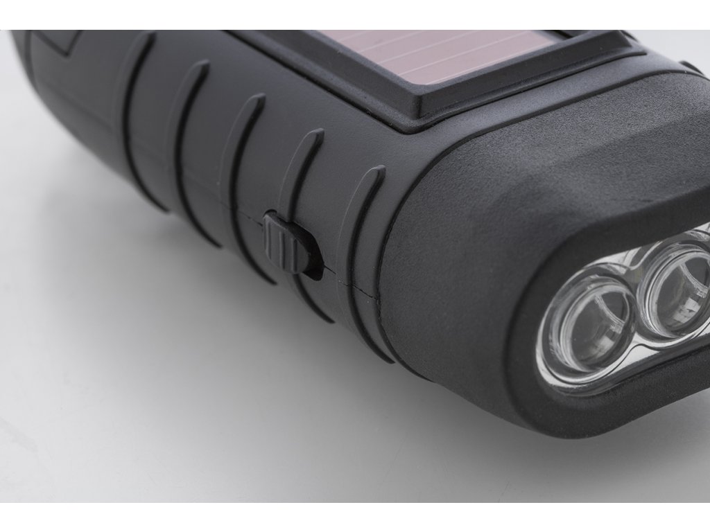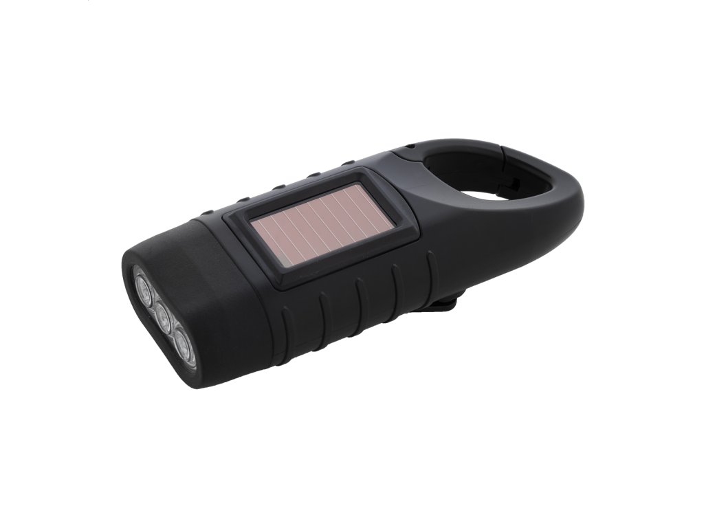 Baterka z recyklovaného ABS plastu s 3 LED diódami, vstavanými solárnymi a dynamovými nabíjačkami a karabínou.