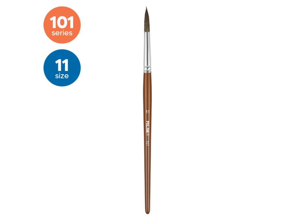 Guľatý štetec č. 11 z prírodného pony vlasu, s hnedou lakovanou rukoväťou z dreva so strieborným bezošvým kovaním, je vďaka jemnosti vlákna vhodný najmä pre použitie v školách na maľbu akvarelovými a temperovými farbami. Dĺžka vlasu 25,6mm. Priemer 6mm.Dodatočné parametre