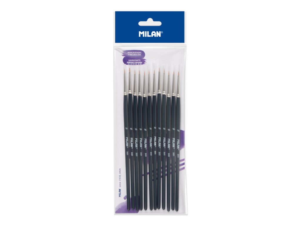 Okrúhly štetec s krátkou drevenou rúčkou MILAN 301. Hnedá lakovaná povrchová úprava a nikel. Zloženie: syntetické štetiny (vlákna 0,12 mm). Vhodné na ručné práce a dekoráciu. Priemer štetín: 2,2 mm. Dĺžka štetín: 4,9 mm. Dĺžka štetca: 168 mm.Dodatočné parametre