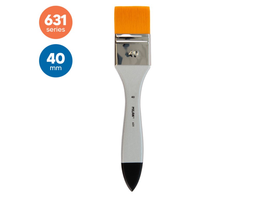 Široký štetec MILAN 631 s krátkou drevenou rúčkou. Lakovaný povrch striebornej farby a hliníková dutinka. Zloženie: syntetické štetiny (vlákna O 0,10 mm). Vhodné na akvarelové, vodové techniky, olejové a akrylové maľby. Šírka štetín: 40 mm. Dĺžka štetín: 30,3 mm. Dĺžka kefy: 210 mm.Dodatočné parametre