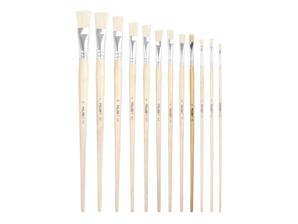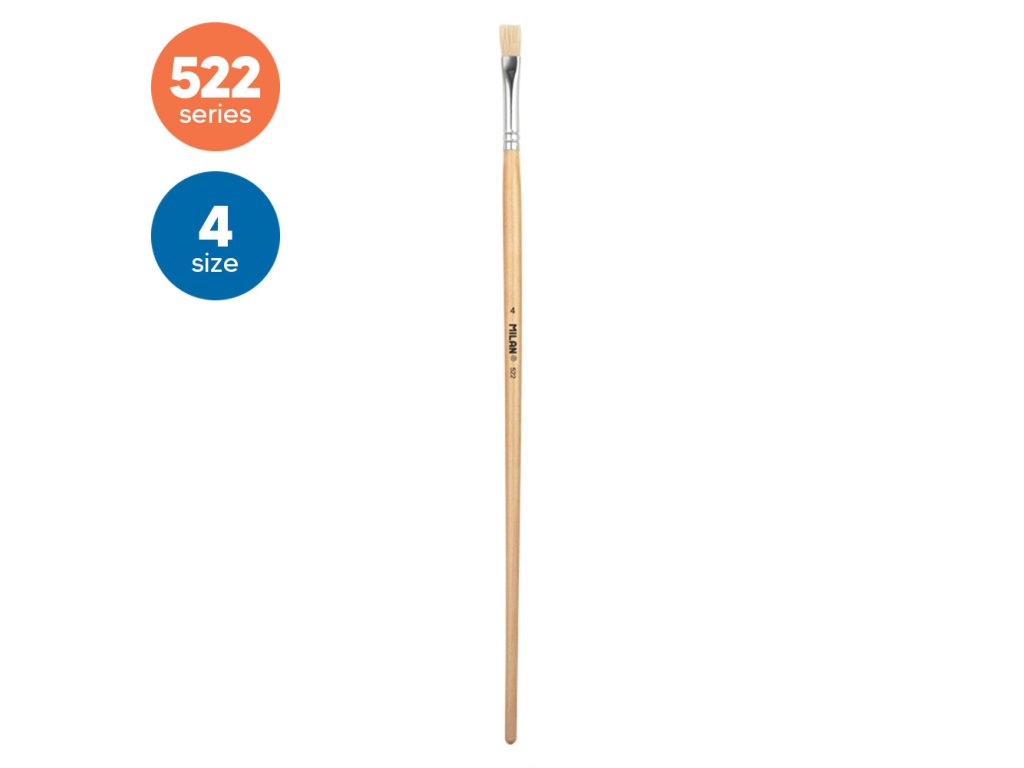 Plochý štetec MILAN 522 s dlhou drevenou rukoväťou. Prírodne zalakovaná povrchová úprava a hliníková dutinka. Zloženie: prírodná štetina ošípaných Chungking. Vhodný na maľovanie olejom a akrylom. Priemer štetín: 7,9 mm. Dĺžka štetín: 15,4 mm. Dĺžka štetca: 300 mm.Dodatočné parametre
