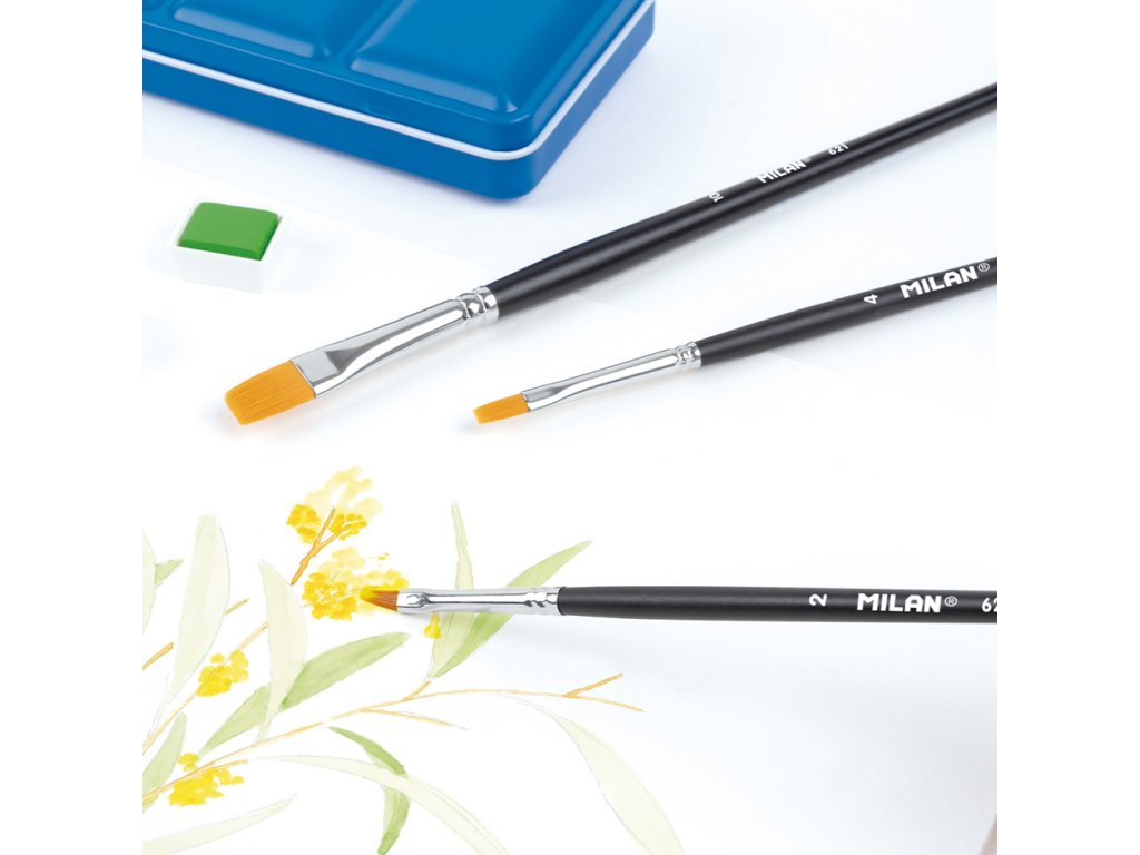 Plochý štetec MILAN 621 s krátkou drevenou rúčkou. Čierna lakovaná povrchová úprava (matná povrchová úprava) a niklová objímka. Zloženie: syntetické štetiny (vlákna O 0,70 mm a O 0,10 mm). Vhodné pre akvarelové a vodné techniky. Priemer štetín: 4,4 mm. Dĺžka štetín: 2,5 mm. Dĺžka štetca: 200 mm. Počet jednotiek: 6.Dodatočné parametre
