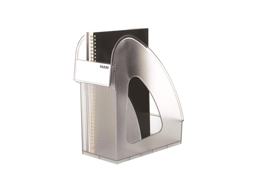Stojan so šírkou chrbta 12 cm vhodný aj na ukladanie maxi brožúr, katalógov a pod. Jeden vyberateľný rozdeľovač ho umožní rozdeliť na 2 časti. Index na chrbtovej časti. Vonkajší rozmer (š × v × h) 120 × 305 × 260 mm.Farba: číra