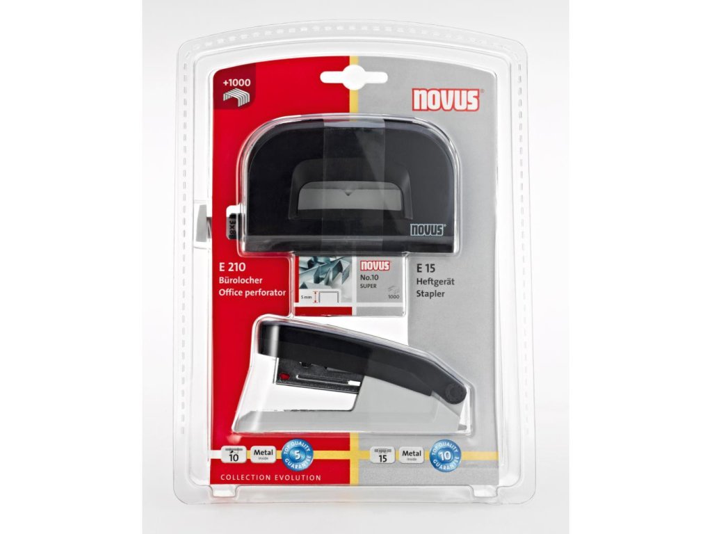Ľahká praktická kancelárska zošívačka a dierovačka z kolekcie Evolution, dodávaná so spinkami. Zošívačka má vrchný diel z plastu a integrovanú kovovú rozošívačku na zadnej časti. Kapacita náplne 100 spiniek veľkosti No.10. Hĺbka zošívania 3,7 cm. Dierovačka má kovovú základňu, plášť v plastovo-kovovom prevedení a posuvné pravítko. Rozpätie dier 8 cm. Farba čierna/sivá.Dodatočné parametre