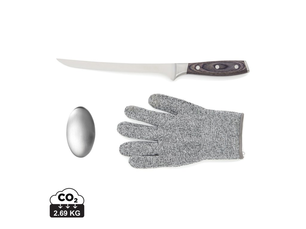 Súprava na filetovanie rýb obsahuje filetovací nôž, rukavice z oceľovej sieťoviny a kovové mydlo. Rukavica umožňuje lepšie uchopenie ryby a zároveň chráni pred prípadnými nehodami. Kovové mydlo odstraňuje pachy, napríklad z rýb a cibule. Nôž je vyrobený z nemeckej ocele X50CrMoV15 s rukoväťou z dreva pakka. Vďaka ľahko uchopiteľnej rukoväti a vynikajúcemu vyváženiu čepele je práca s nožom pohodlná a jednoduchá. Veľkosť: 21 cm čepeľ.Dodatočné parametre