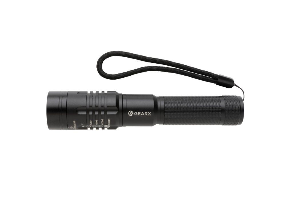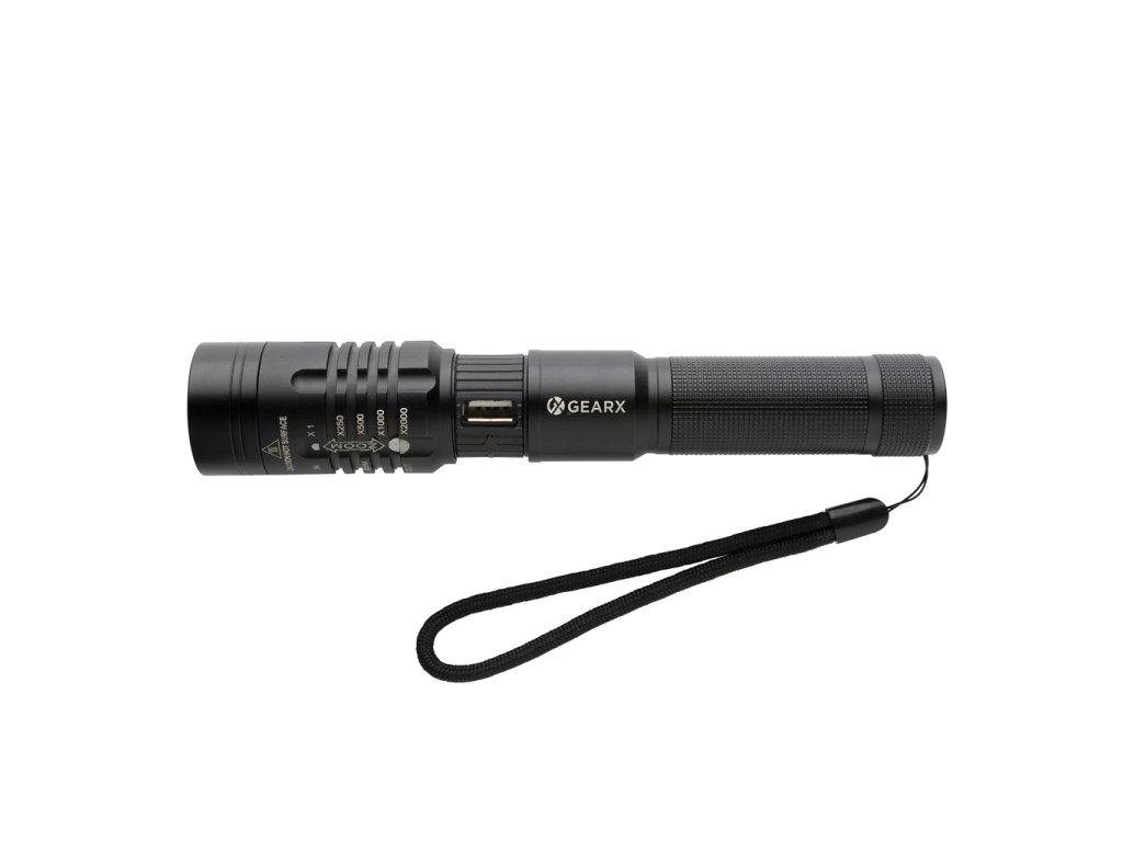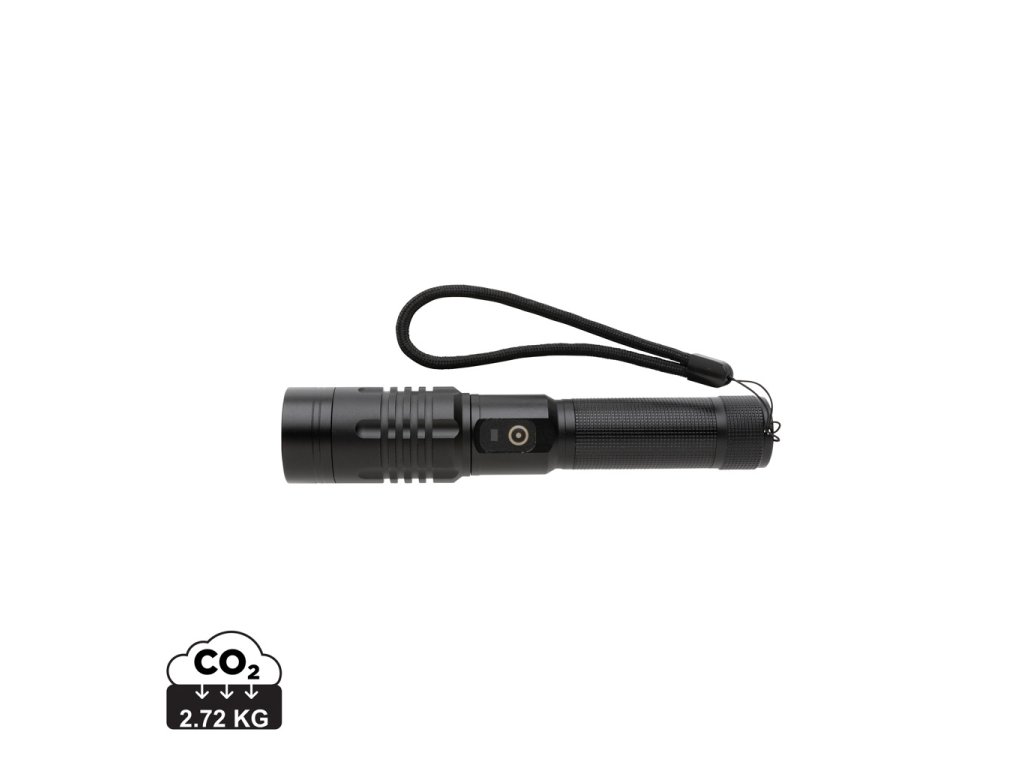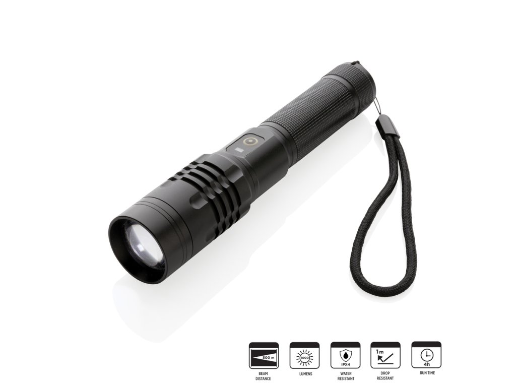 Vysoko funkčné, výkonné a veľmi štýlové opakovane dobíjateľné svietidlo. Telo vyrobené z prémiového hliníka skvele padne do ruky. Funkcia rozostrenia svetla umožňuje jeho rozšírenie až o 2000 násobok. Výkonná žiarovka so svietivosťou 1 000 lúmenov a dosvitom až 500 m. Viac módov svetla vrátane SOS. IPX4 zabezpečuje odolnosť voči nepriazni počasia alebo vlhkosti. Integrovaná batéria s kapacitou 2 000 mAh umožňuje opakované dobíjanie jednoducho cez USB port a používanie až 4h na jedno nabitie.Dodatočné parametre