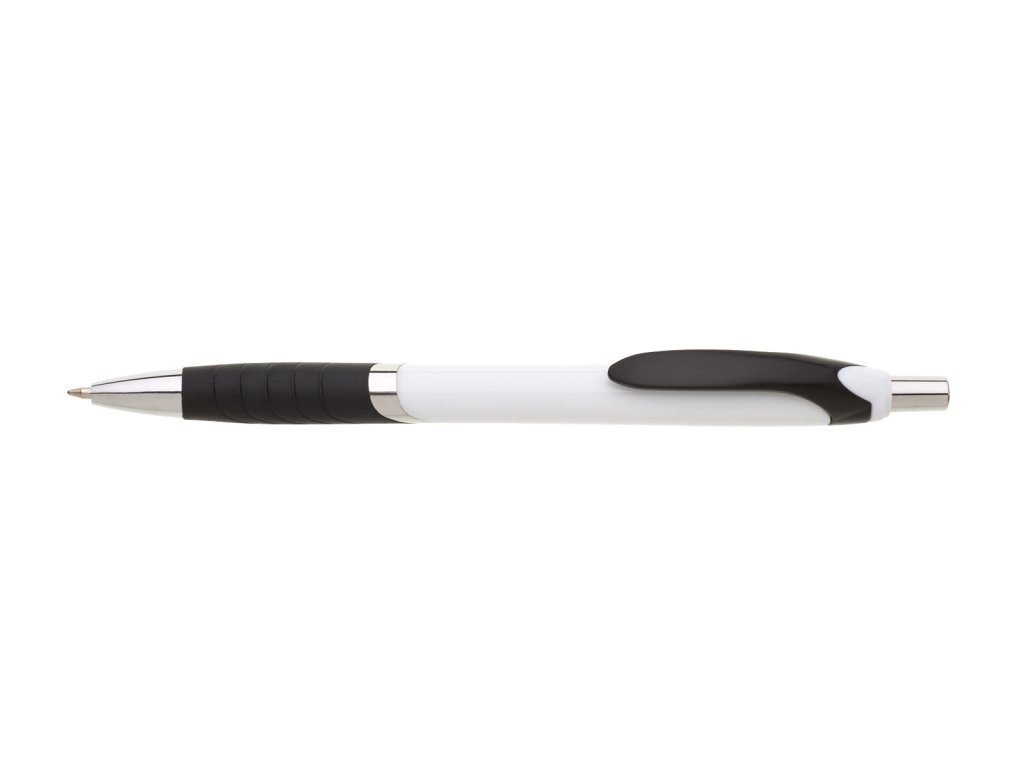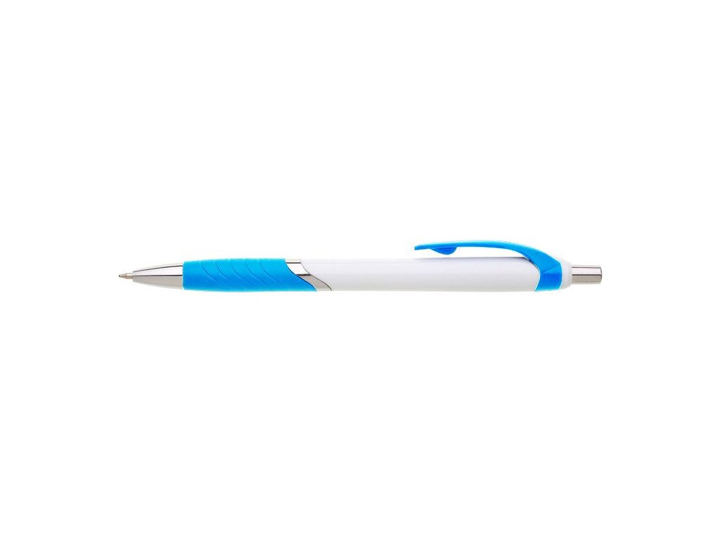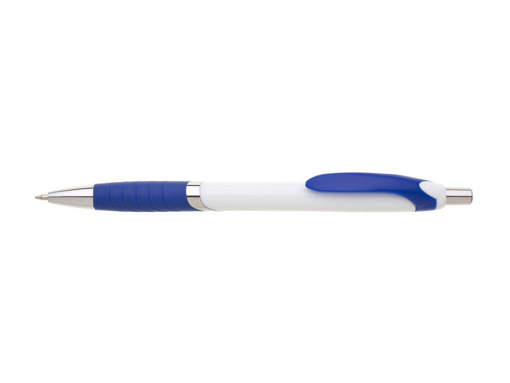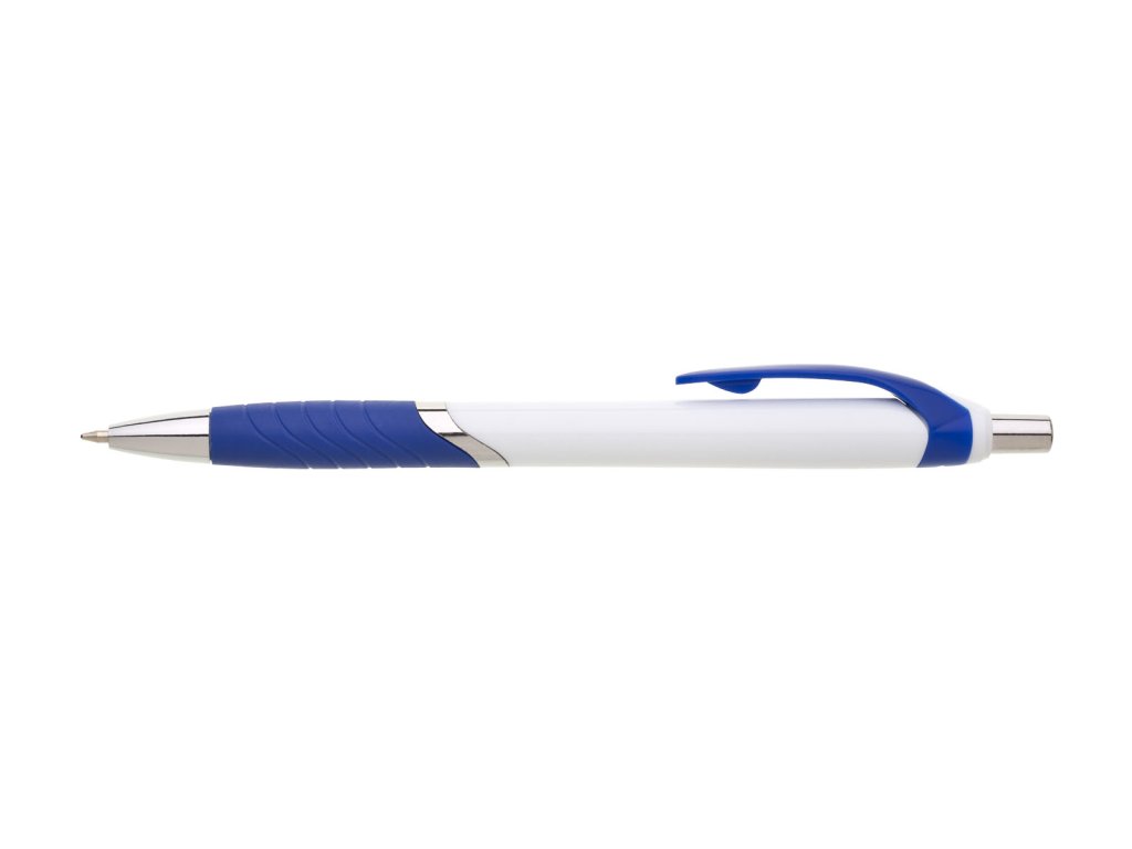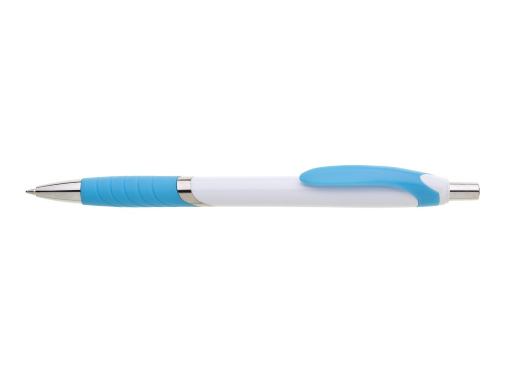 Biele guľôčkové pero TEMPO s farebným pogumovaným úchopom, klipom a striebornýmí doplnkami. Modrá náplň X-20.Dodatočné parametre