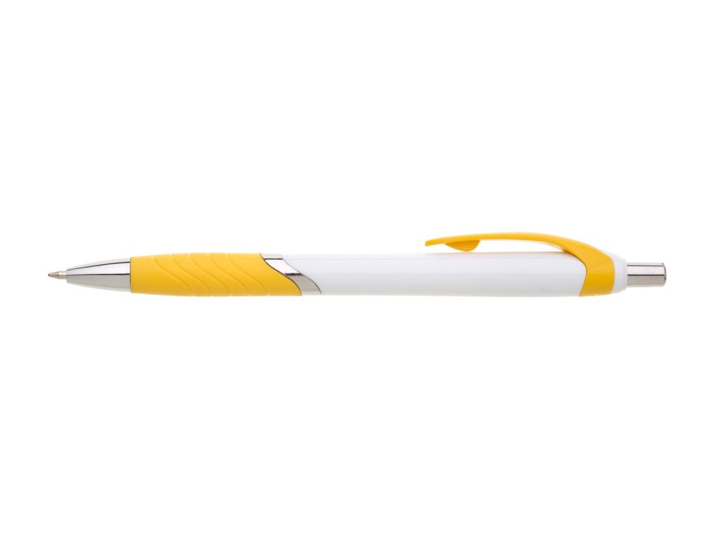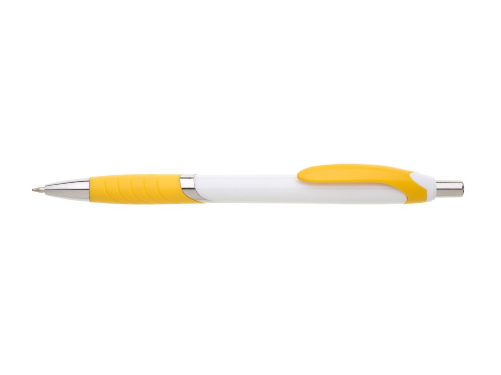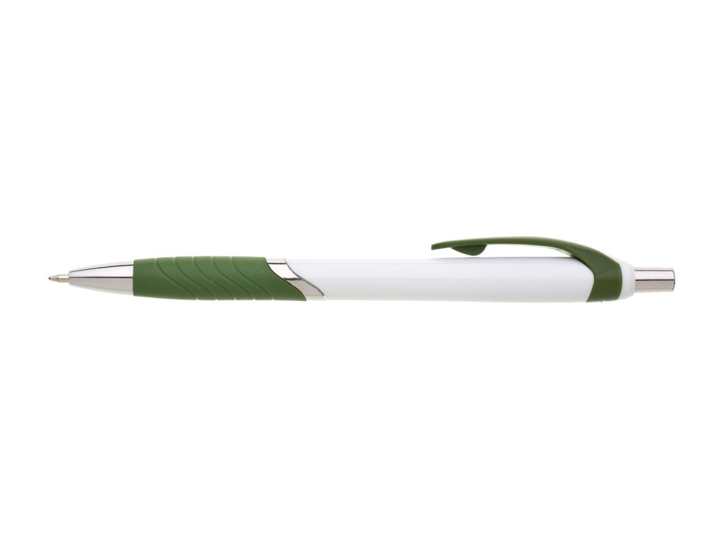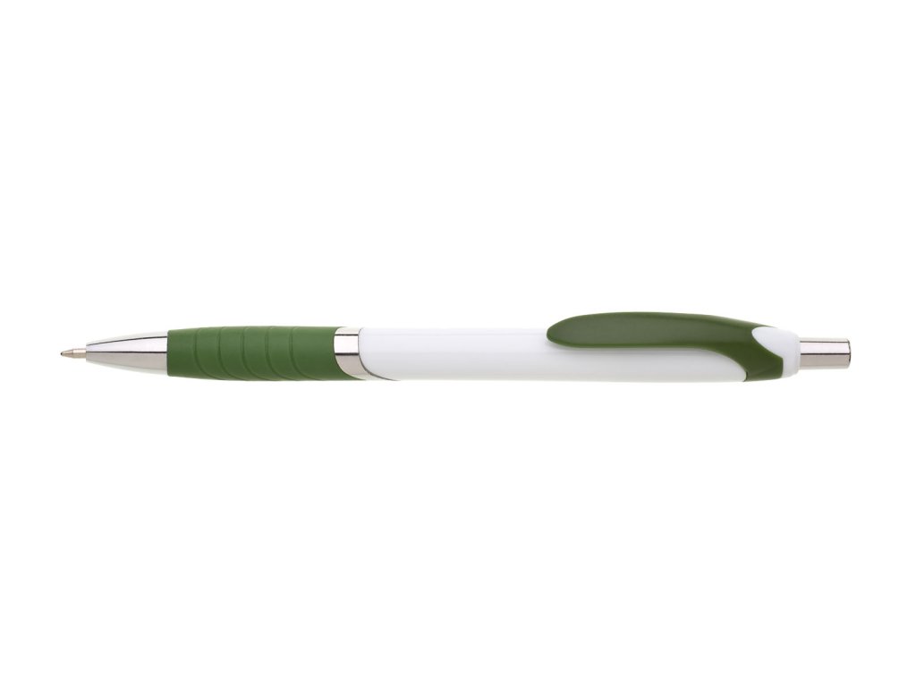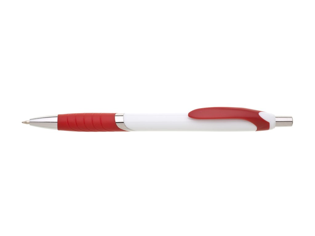 Biele guľôčkové pero TEMPO s farebným pogumovaným úchopom, klipom a striebornýmí doplnkami. Modrá náplň X-20.Dodatočné parametre