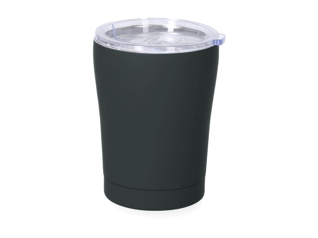 Dvojstenný, nerezový izolovaný termo hrnček s pogumovanou úpravou a viečkom na pitie, 350 ml.Dodatočné parametre