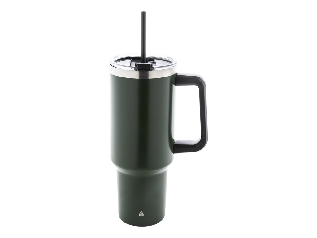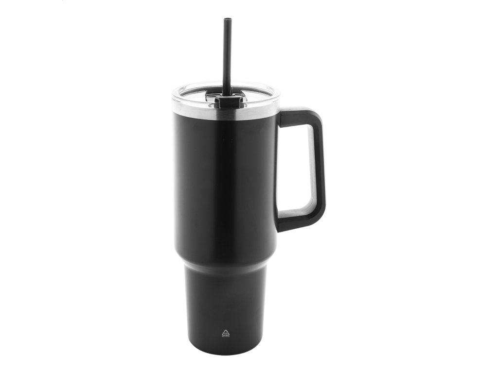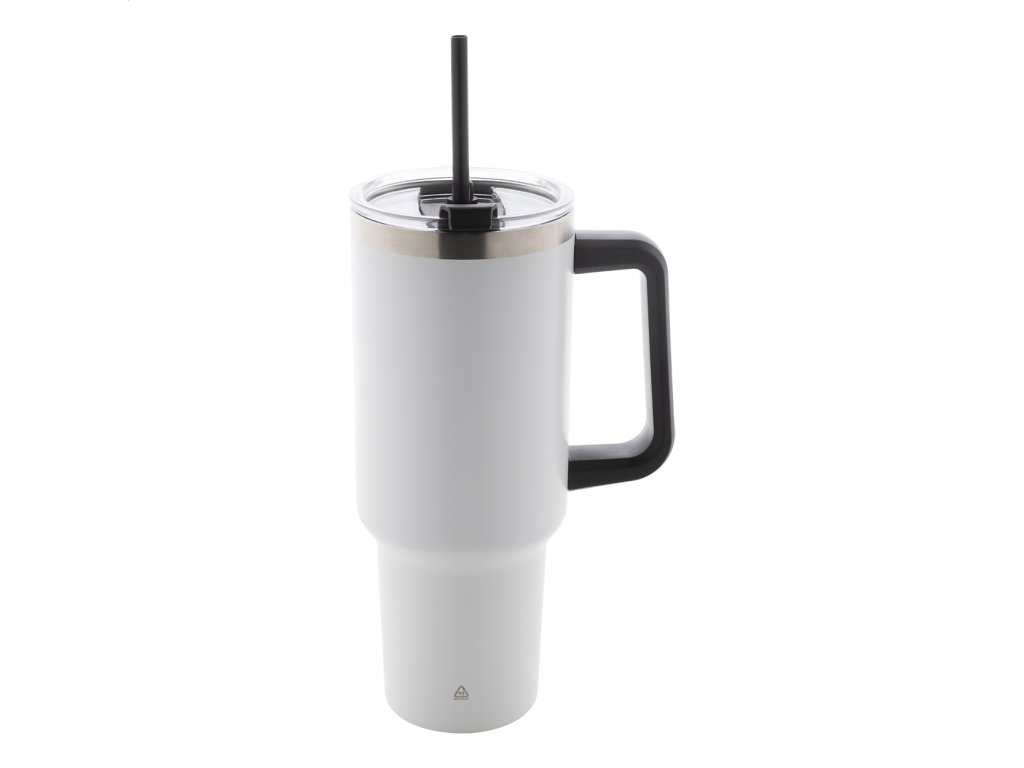 Dvojplášťový vákuovo izolovaný termo hrnček z recyklovanej nerezovej ocele s PS viečkom na pitie a PP slamkou. 1200 ml.Dodatočné parametre