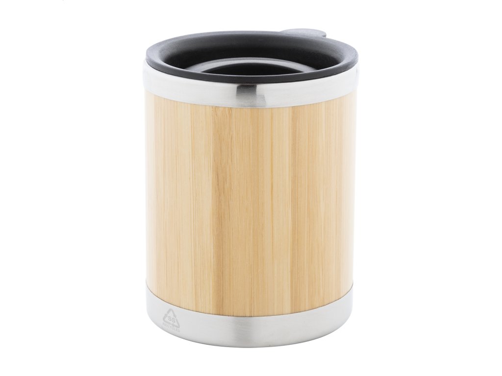 Bambusom pokrytý, dvojstenný recyklovaný nerezový izolovaný termo hrnček s PP viečkom na pitie, 300 ml.Dodatočné parametre