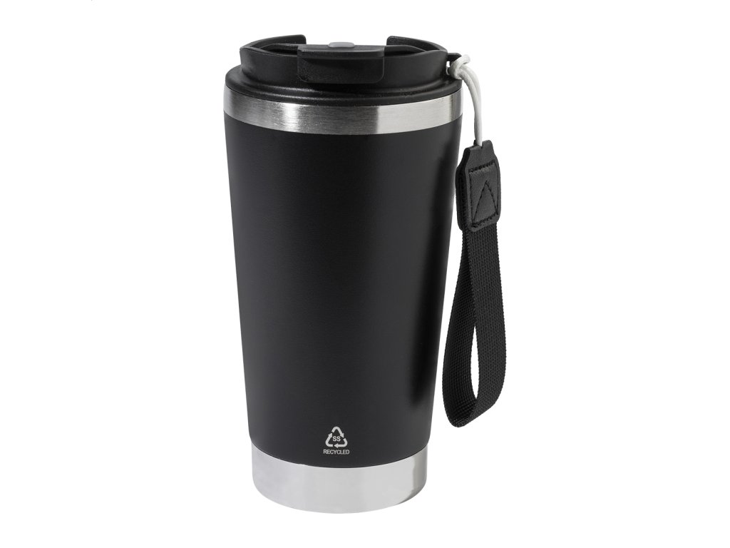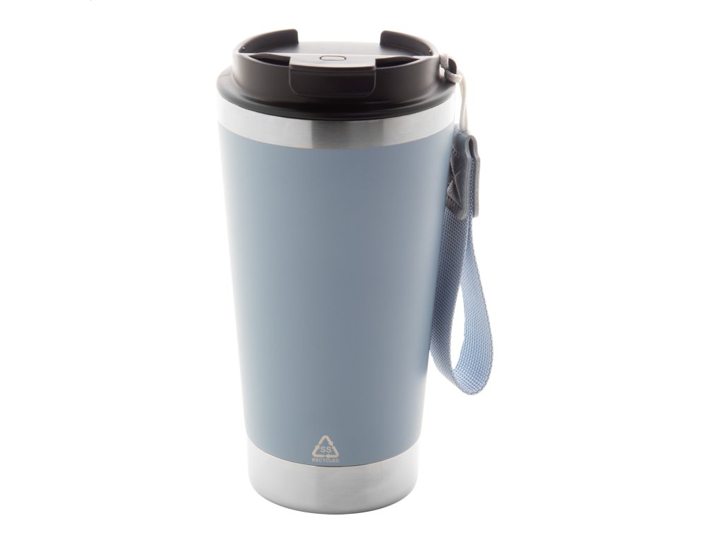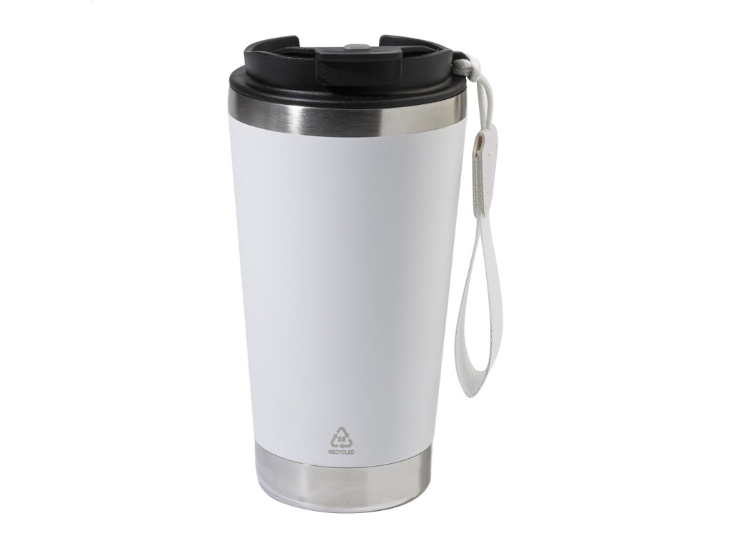 Dvojstenný termo hrnček z recyklovanej nerezovej ocele s viečkom na pitie z PP a popruhom na prenášanie v zodpovedajúcej farbe. 430 ml.Dodatočné parametre
