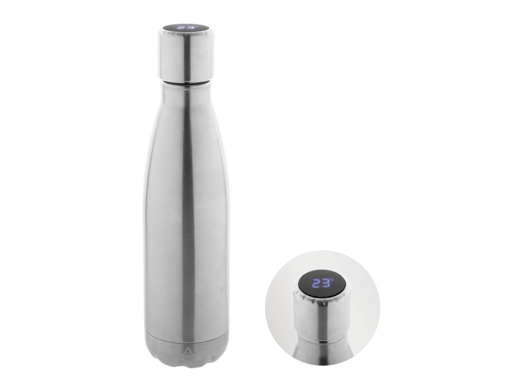 Dvojstenná vákuovo izolovaná termoska z recyklovanej nerezovej ocele s dotykovým LED teplomerom na viečku. 500 ml. So vstavanou USB dobíjacou batériou. Vrátane USB nabíjacieho kábla.Dodatočné parametre