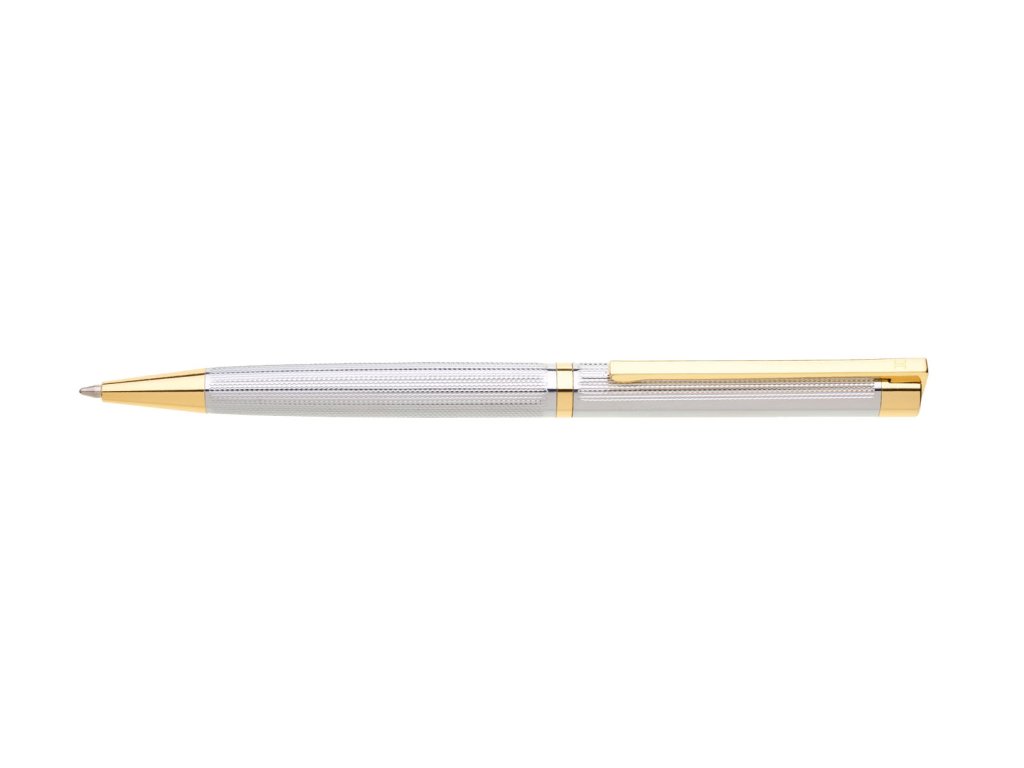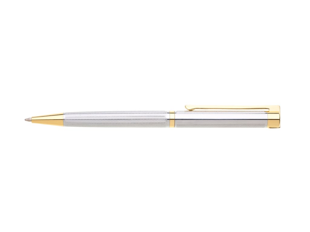 Elegantné strieborné kovové pero TRAMONTO s jemným dekorom a zlatými doplnkami. Otočný mechanizmus, v hornej časti hladký priestor pre logo. Modrá náplň velkoobjemová. Kolekcia GABRIELIS.Dodatočné parametre