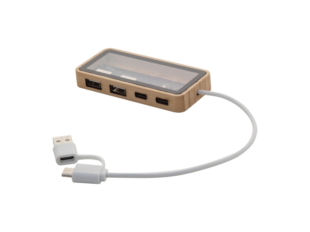 Polopriehľadný bambusový USB hub s viditeľnými elektronickými súčiastkami, 2 USB a 2 USB-C portami, USB 2.0. Vrátane kábla s pripojením USB a USB-C.Dodatočné parametre
