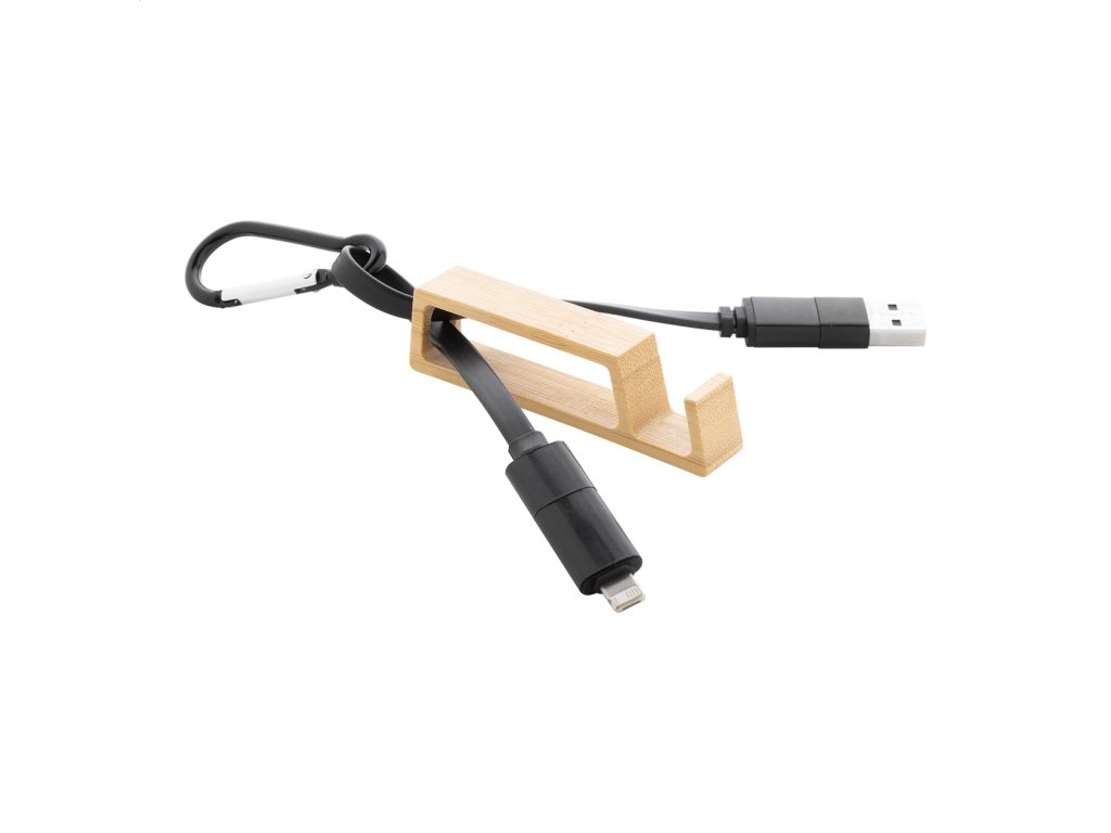 USB nabíjací kábel s karabínou z recyklovaného hliníka a bambusovým držiakom na mobil. S konektormi micro USB, USB-C a Lightning. So vstupmi USB a USB-C.Dodatočné parametre