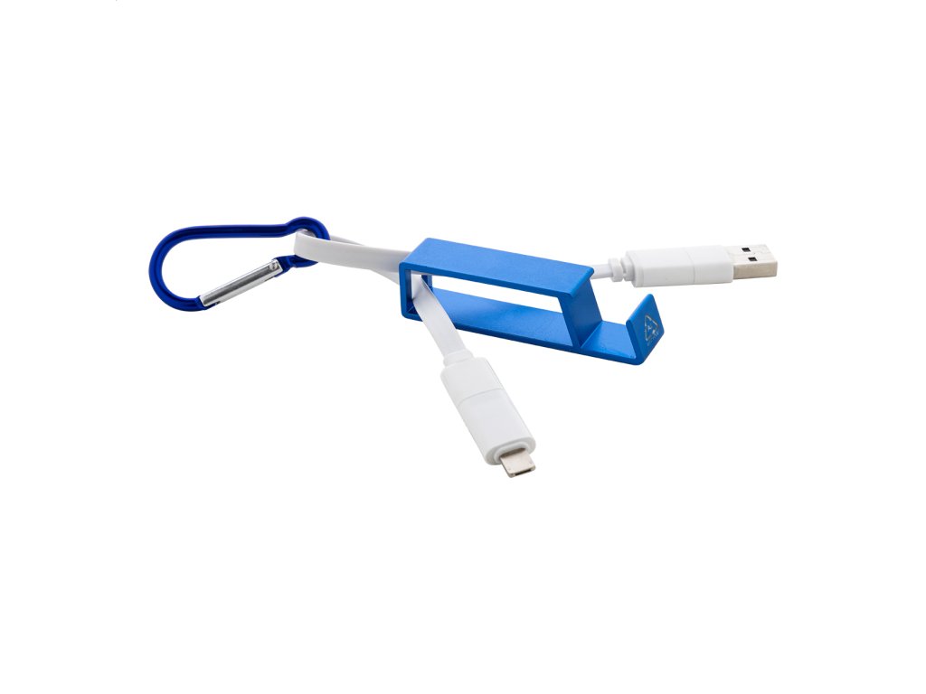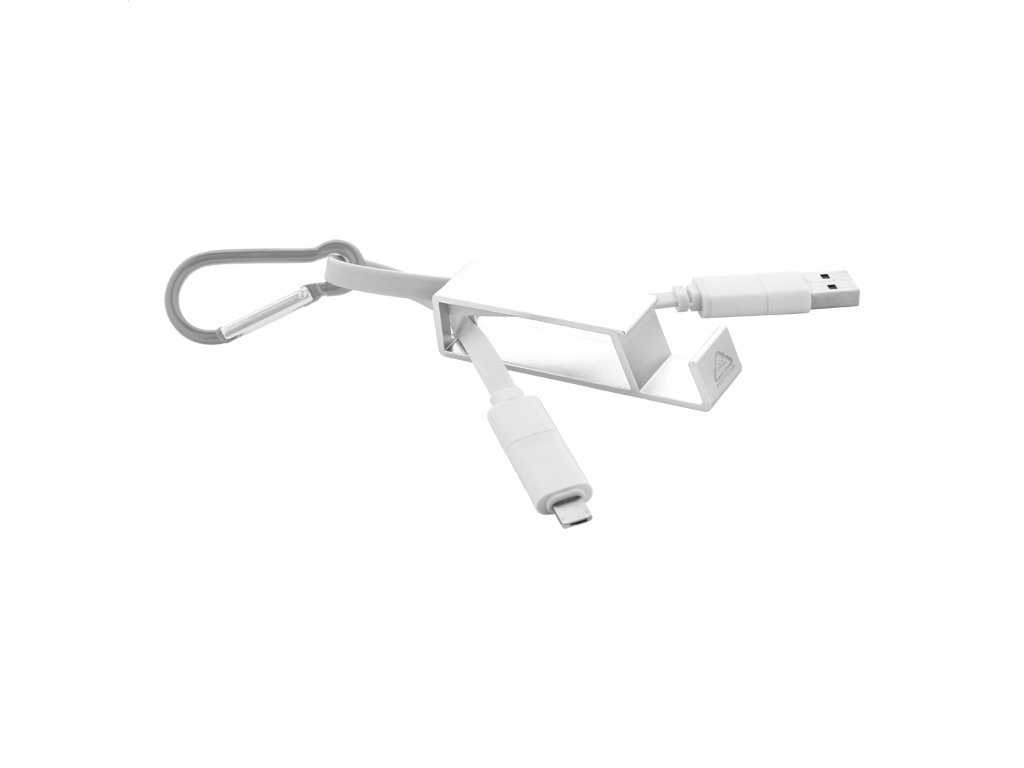 USB nabíjací kábel s karabínou z recyklovaného hliníka a držiakom na mobil s funkciou otvárača fliaš. S konektormi micro USB, USB-C a Lightning. So vstupmi USB a USB-C.Dodatočné parametre