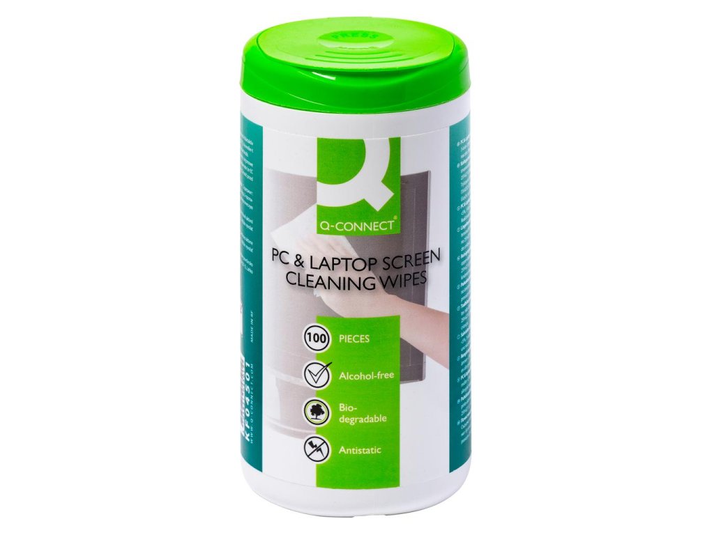 Mokré utierky balené v dóze vhodné na notebooky, LCD, TFT a plazmové obrazovky. Bez obsahu alkoholu, nehorľavé. V balení 100 útržkov.Biologicky odburateľný.