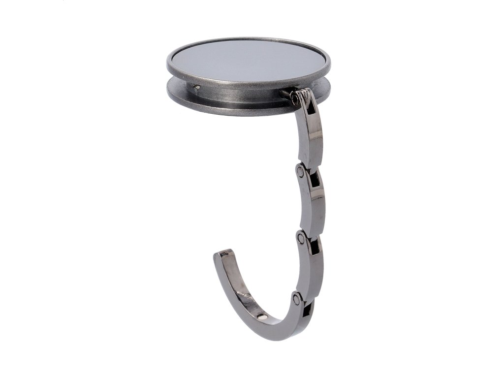 Kovový vešiačik na tašku, farba gun metal, s lesklým povrchom. Magnetické zatváranie.Dodatočné parametre