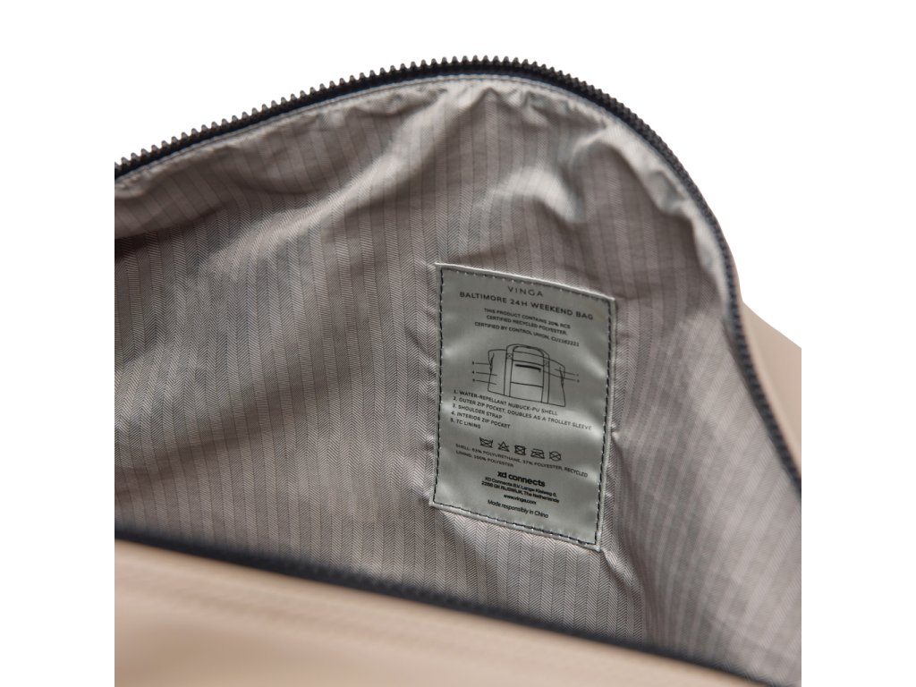 Cestovná víkendová taška vyrobená z čiastočne recyklovaného polyesteru s certifikáciou RCS a elegantným PU povrchom. Navrhnutá tak, aby sa do nej zmestilo všetko, čo potrebujete na 1-2 noci. Tašku jednoducho upevníte na kufor pomocou inteligentného vrecka na zips 2 v 1. Je vybavená ako pohodlnými popruhmi pre nosenie v ruke, tak odnímateľným nastaviteľným ramenným popruhom. Vnútri menšie vrecko na zips pre vaše nevyhnutnosti. Certifikácia RCS zaručuje, že celý dodávateľský reťazec recyklovaných materiálov je certifikovaný. Celkový recyklovaný obsah vychádza z celkovej hmotnosti výrobku. Tento výrobok obsahuje 20% recyklovaného polyesteru s certifikáciou RCS.Dodatočné parametre
