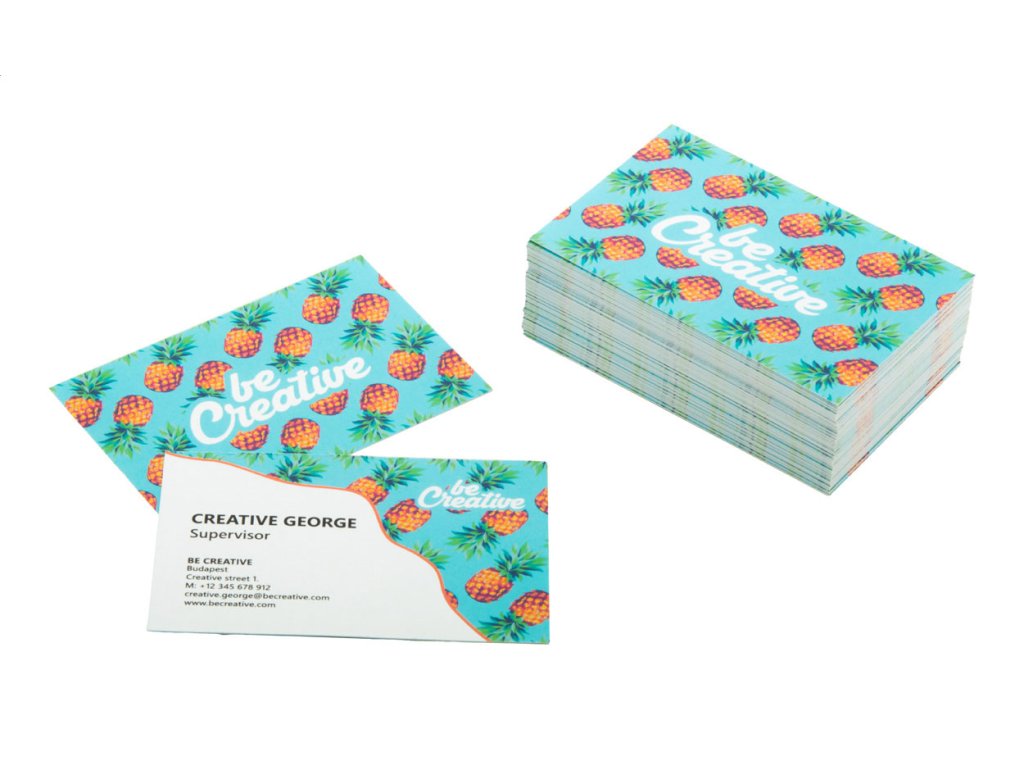 100 ks vizitiek vyrobených na zákazku s plnofarebnou tlačenou grafikou na oboch stranách. Matný biely papier, 350 g/m². V bielej papierovej krabici.Dodatočné parametre